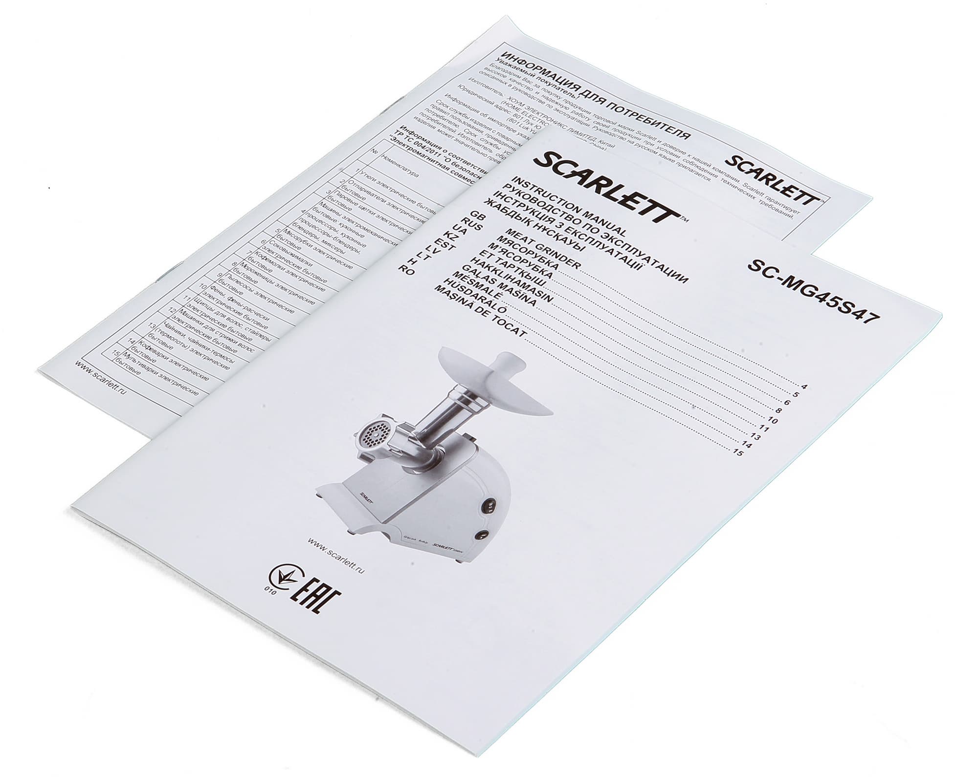 Очищать съемные части рекомендуется в теплой мыльной воде с нейтральным моющим средством. Мыть силуминовые детали в посудомоечной машине запрещено. Также не следует погружать блок с электромотором в воду. После мытья все металлические детали следует протереть сухой тканью. Если мясорубка не будет использоваться в течение длительного времени, то все металлические части рекомендуется протереть тканью, смоченной в растительном масле. Производитель советует протирать нож и решетку тканью, пропитанной растительным маслом, после каждого использования мясорубки. По результатам экспериментов можем сказать, что уход занимает обычное количество времени. Никаких особых замечаний по уходу за Scarlett SC-MG45S47 мы высказать не можем.