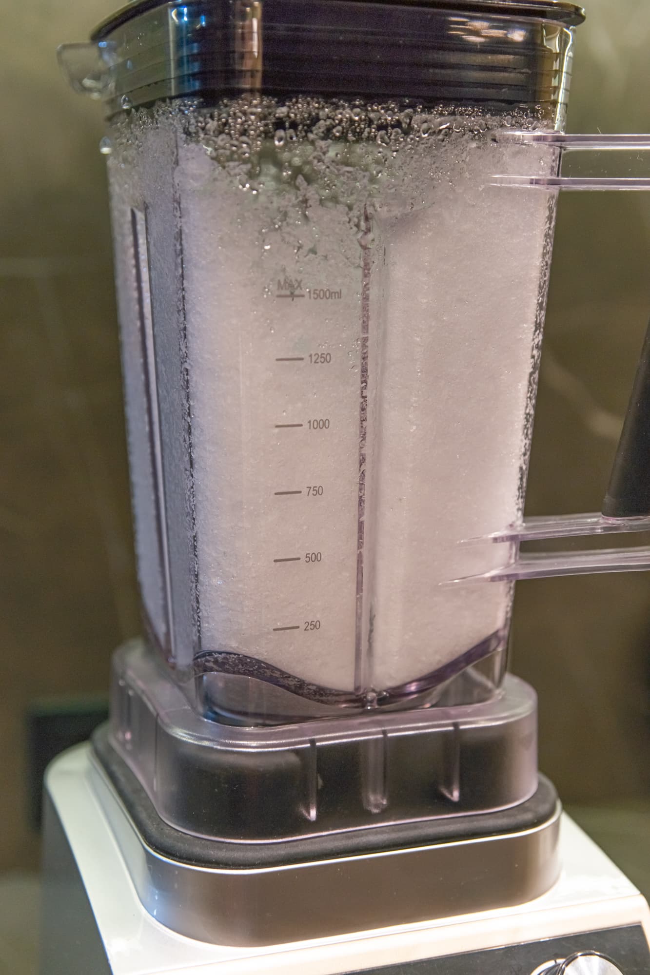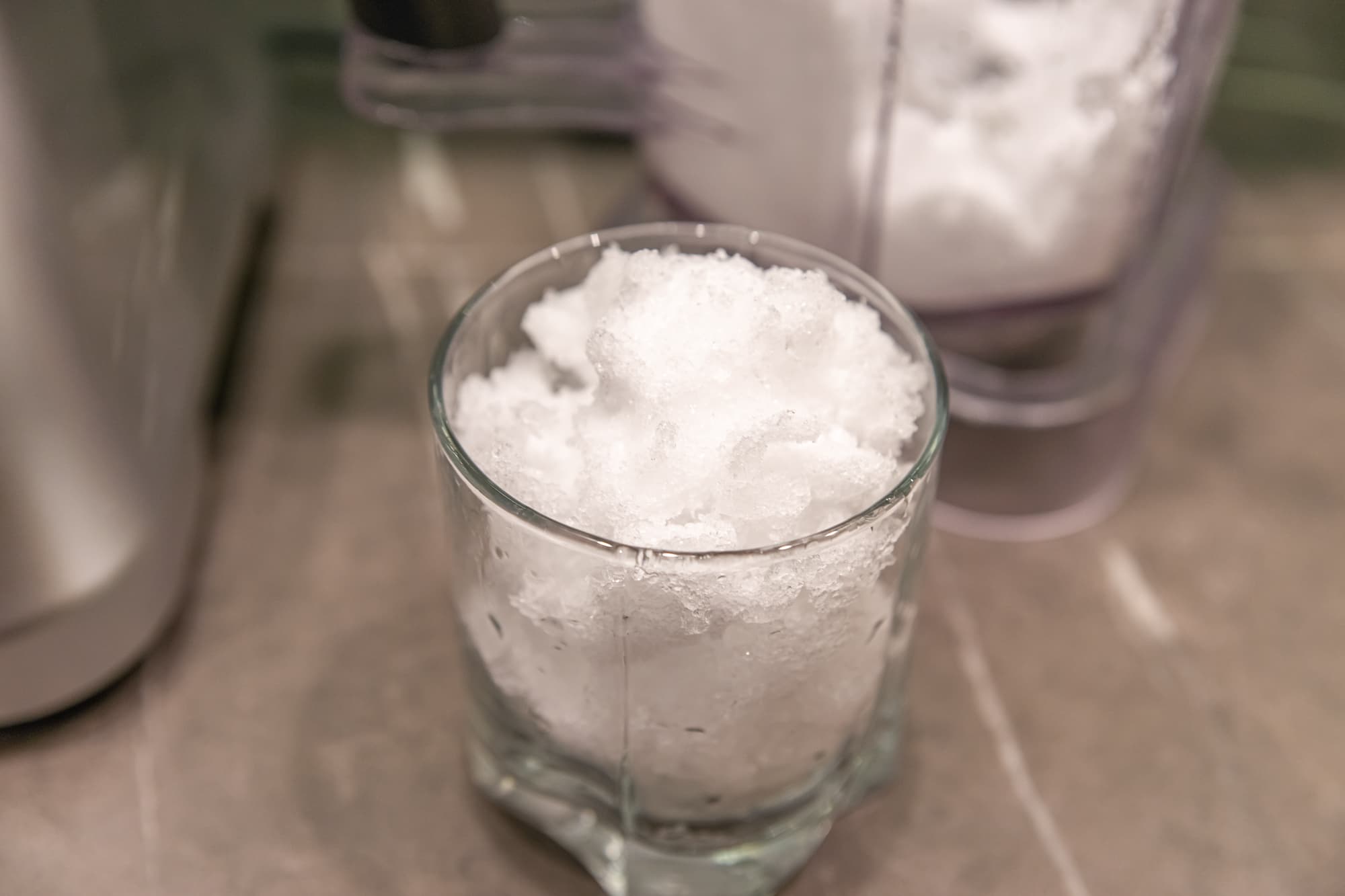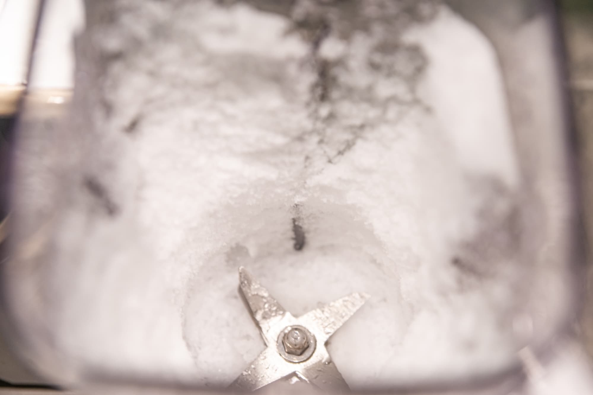 Лед был перемолот в снежную крошку в целом за минуту, в течение которой мы запускали блендер в режиме Pulse секунд на 10 и отпускали на 5. Как видно на фото ниже, ни одной льдинки не уцелело.