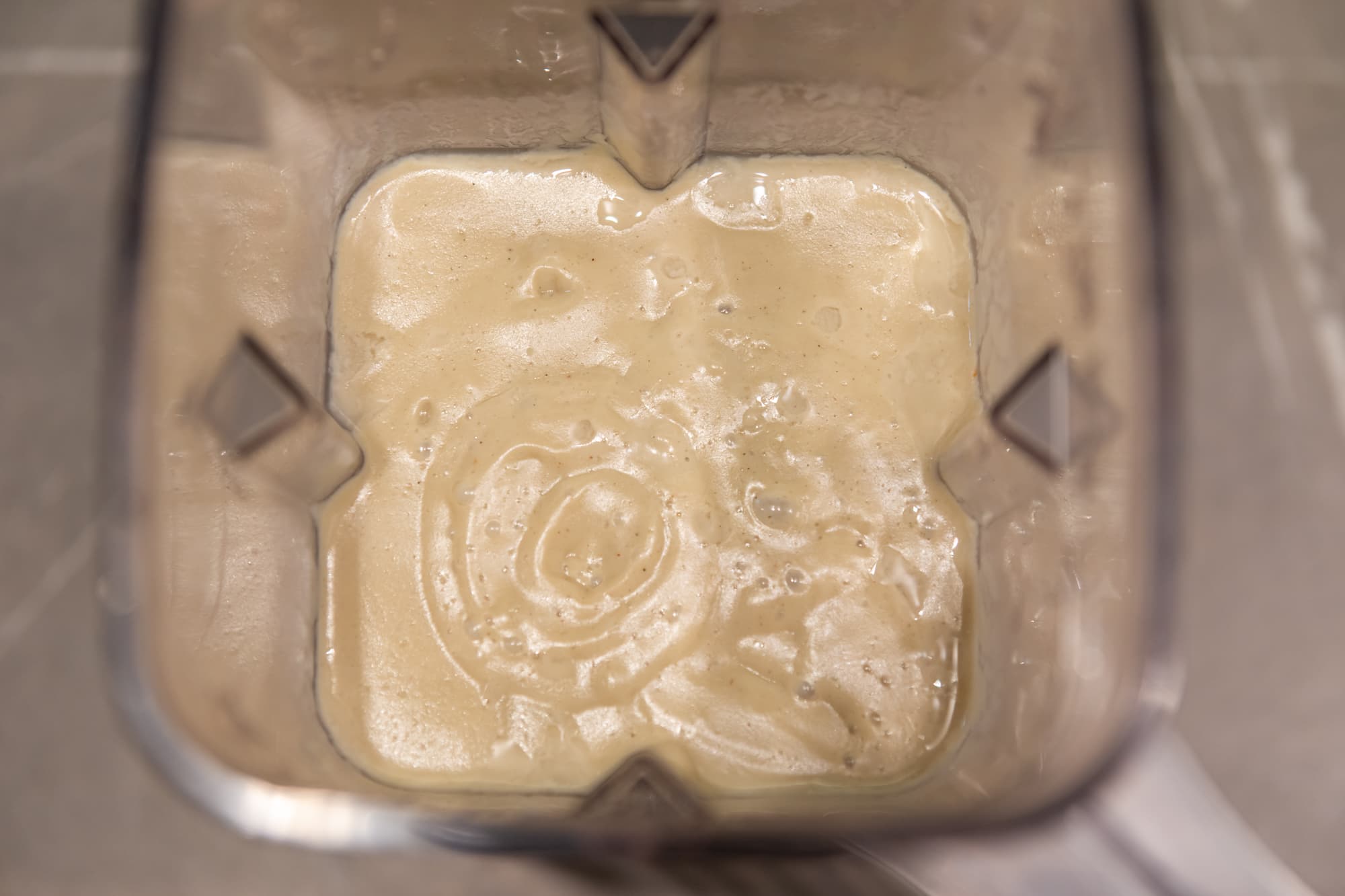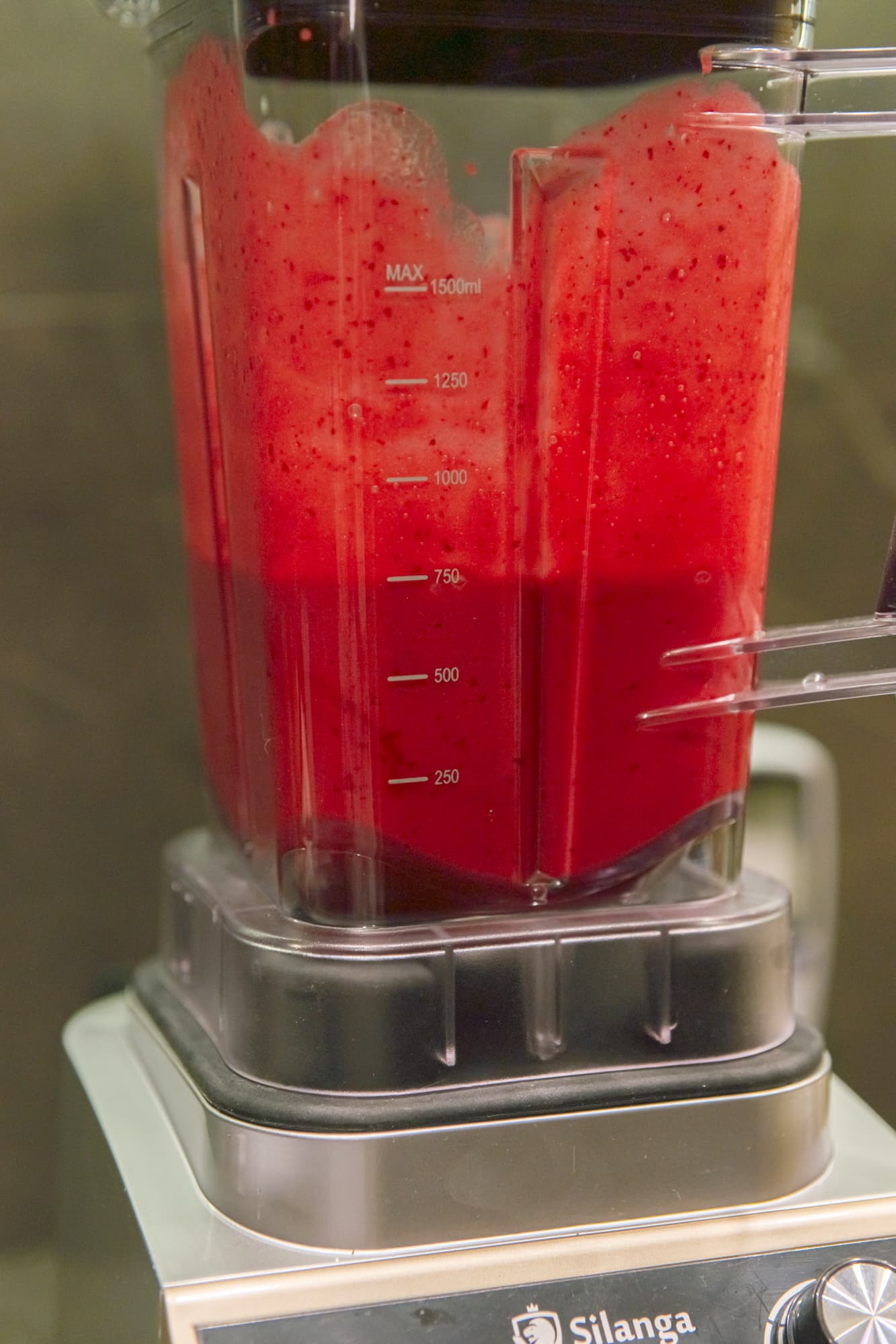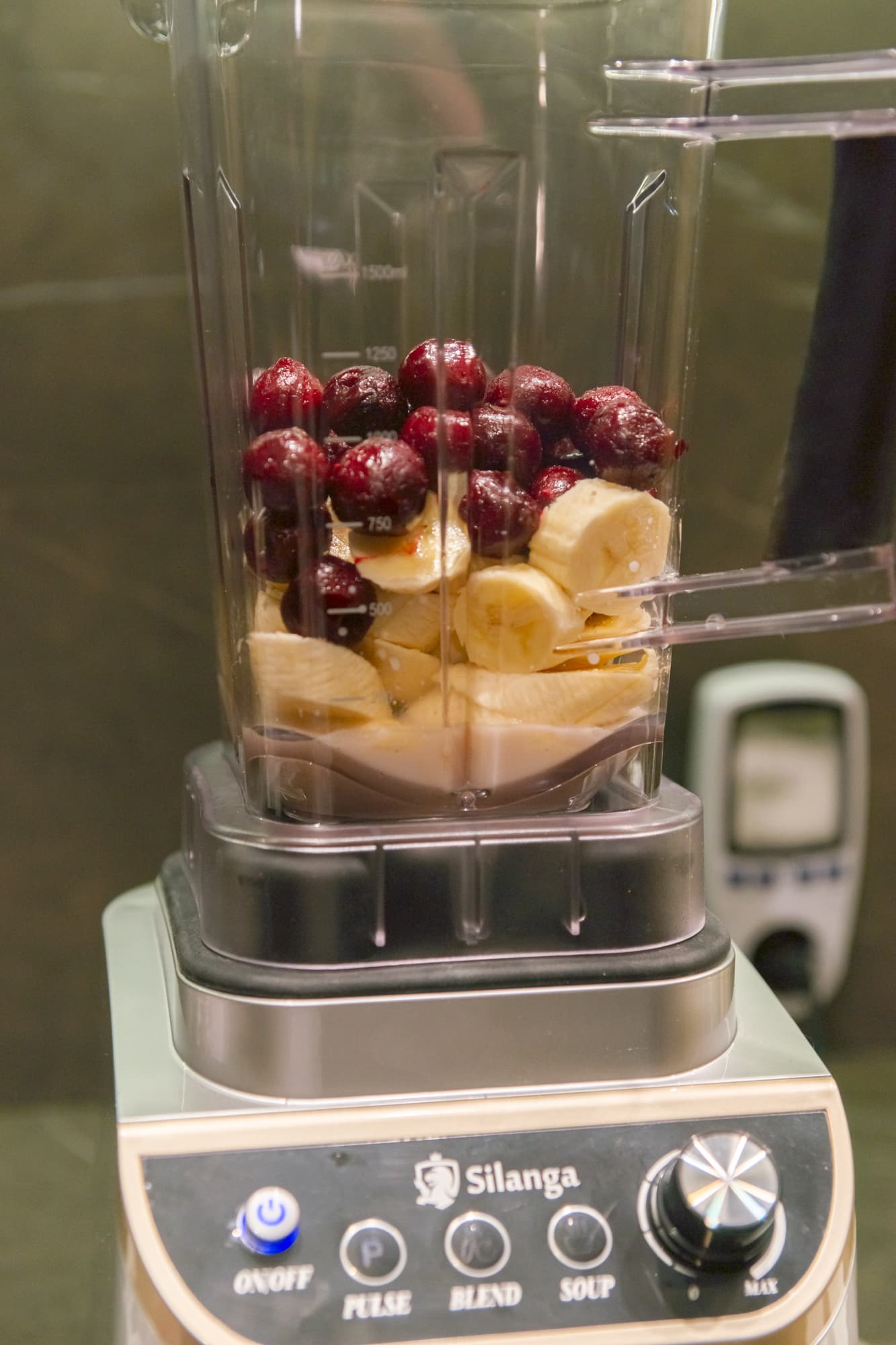 Мы поместили в кувшин нарезанный банан, подлили около 100 мл миндального молока и сверху засыпали вишней прямо из морозилки. Включили блендер в автоматическом режиме Blend и стали наблюдать. Цикл программы рассчитан на минуту, но уже через 20 секунд фруктово-ягодная масса с огромной скоростью летающая по кувшину выглядела однородной и мы выключили прибор.