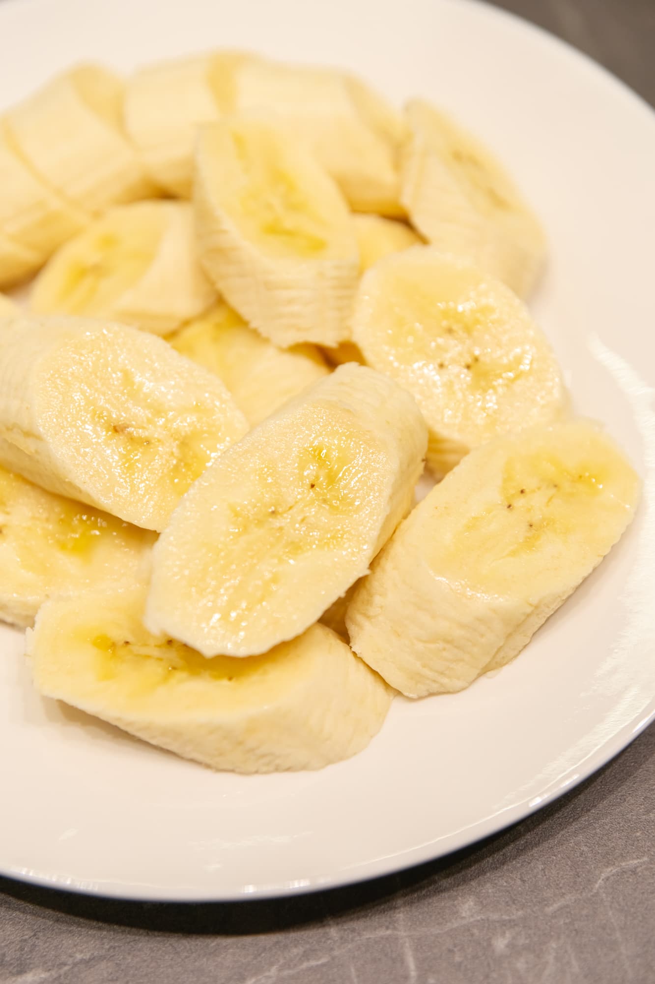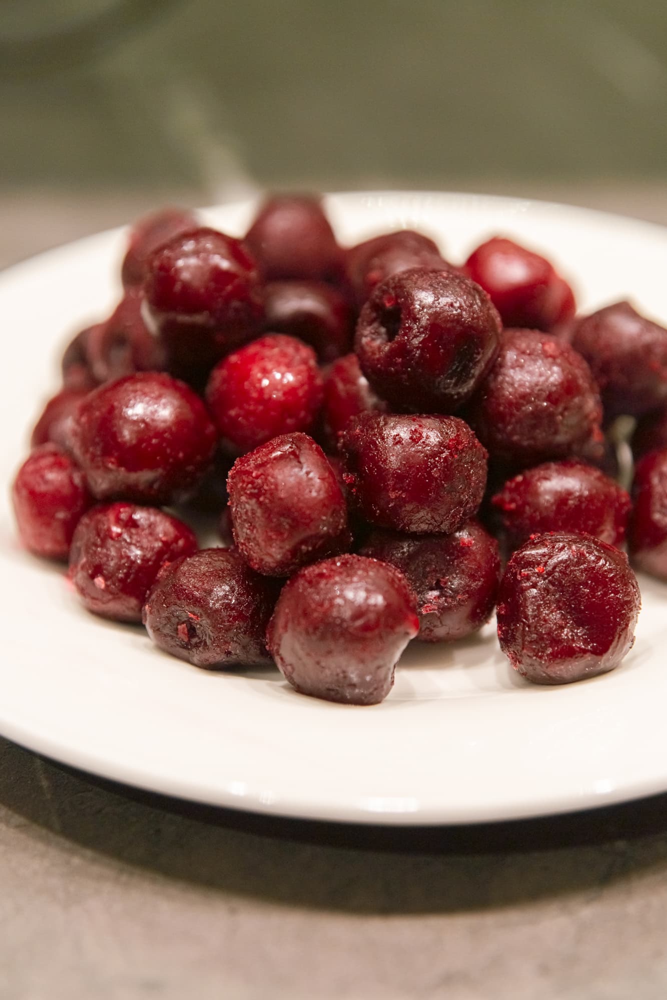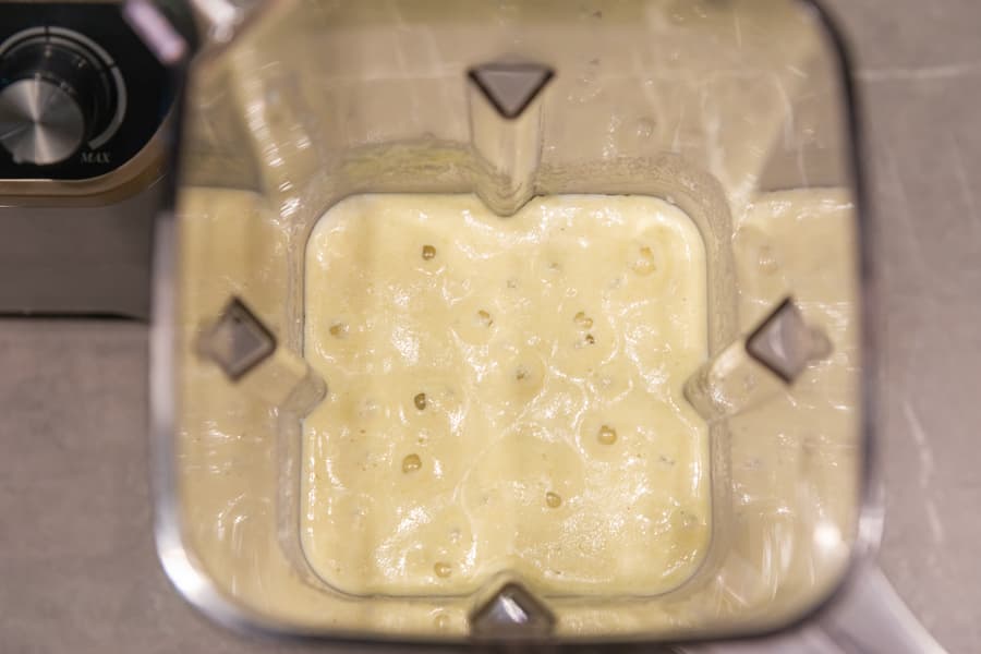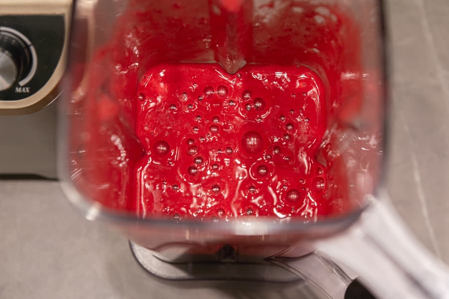Мы поместили в кувшин нарезанный банан, подлили около 100 мл миндального молока и сверху засыпали вишней прямо из морозилки. Включили блендер в автоматическом режиме Blend и стали наблюдать. Цикл программы рассчитан на минуту, но уже через 20 секунд фруктово-ягодная масса с огромной скоростью летающая по кувшину выглядела однородной и мы выключили прибор.
