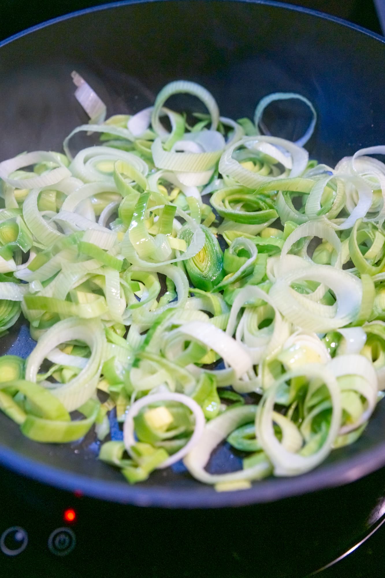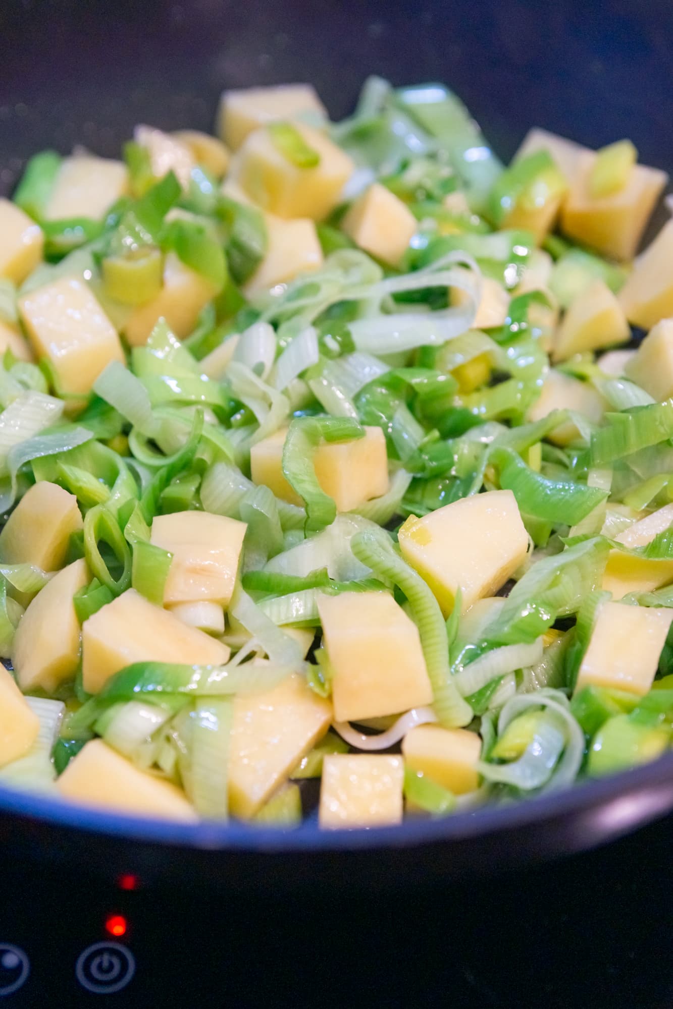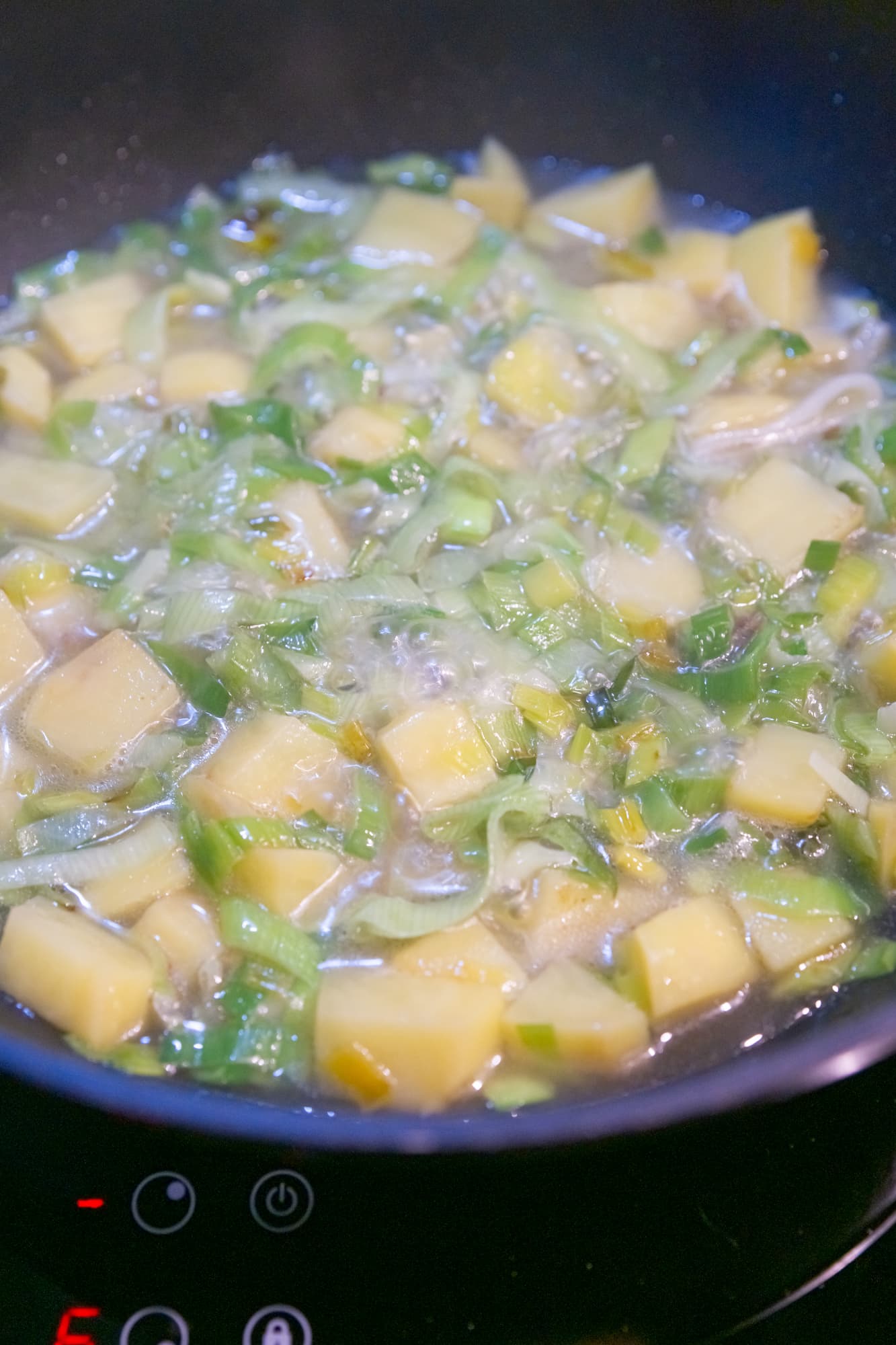 Нарезанный кольцами лук-порей обжарили на сливочном масле до мягкости. Картофель кубиками сначала отправили в сковородку к луку обжариваться, затем залили всё горячим куриным бульоном, поперчили, посолили и оставили вариться примерно минут на 20, до полной готовности картошки.