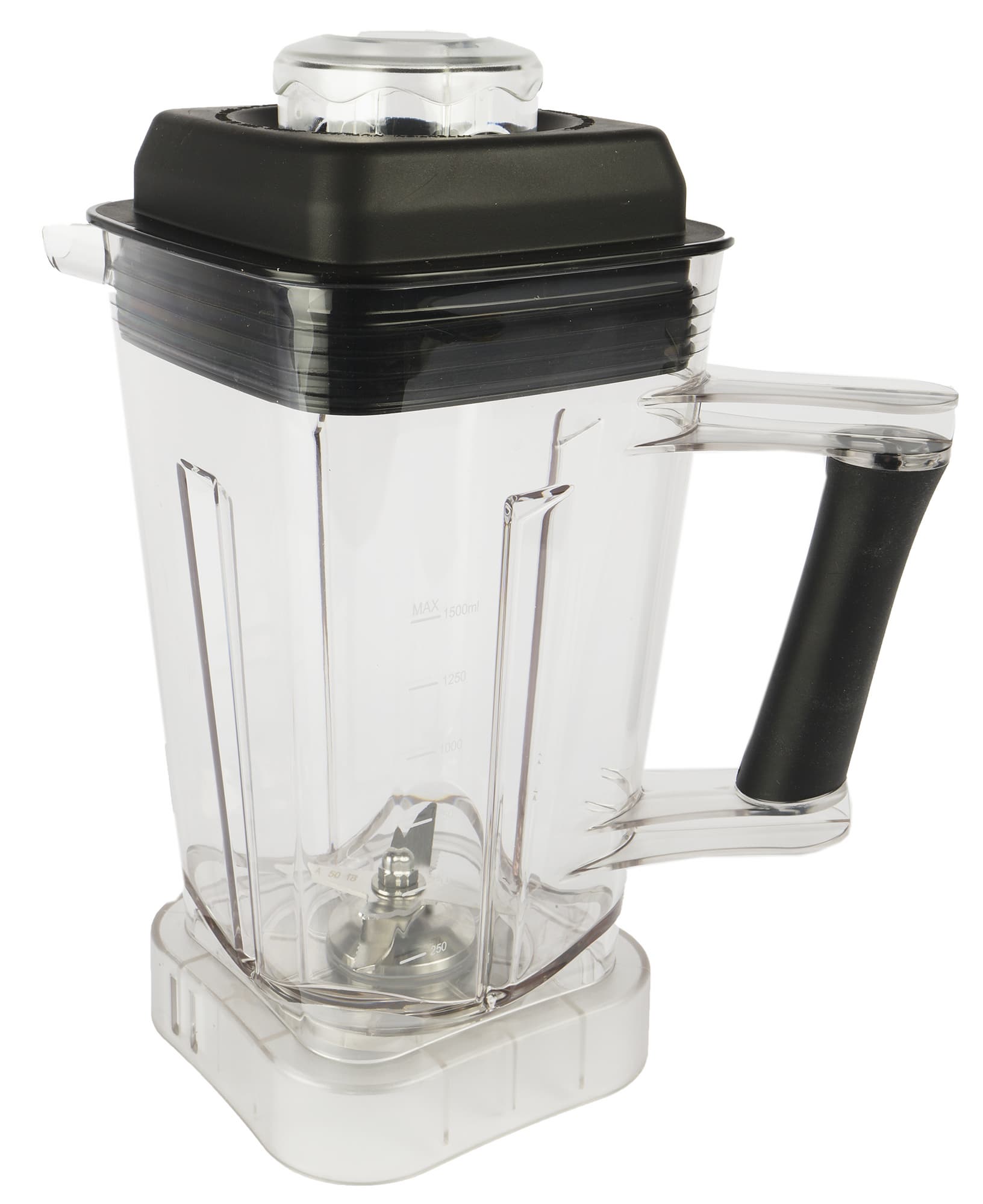 Кувшин с рабочим объемом в 1,5 литра выполнен из толстостенного прозрачного пластика (тритана). На одной из граней имеются отметки от 250 до 1500 мл, с шагом в 250 мл. Большая удобная ручка оснащена резиновой вставкой. Если смотреть сверху, форма кувшина — квадрат с закругленными углами. Сбоку мы видим, что емкость вверху немного расширена. С внутренней стороны стенок для эффективного смешивания продуктов есть четыре выступа, а дно кувшина по периметру волнообразное. На кувшине также есть носик. При установленной крышке отверстие носика полностью закрыто, так что для выливания жидкости, деталь следует снимать.