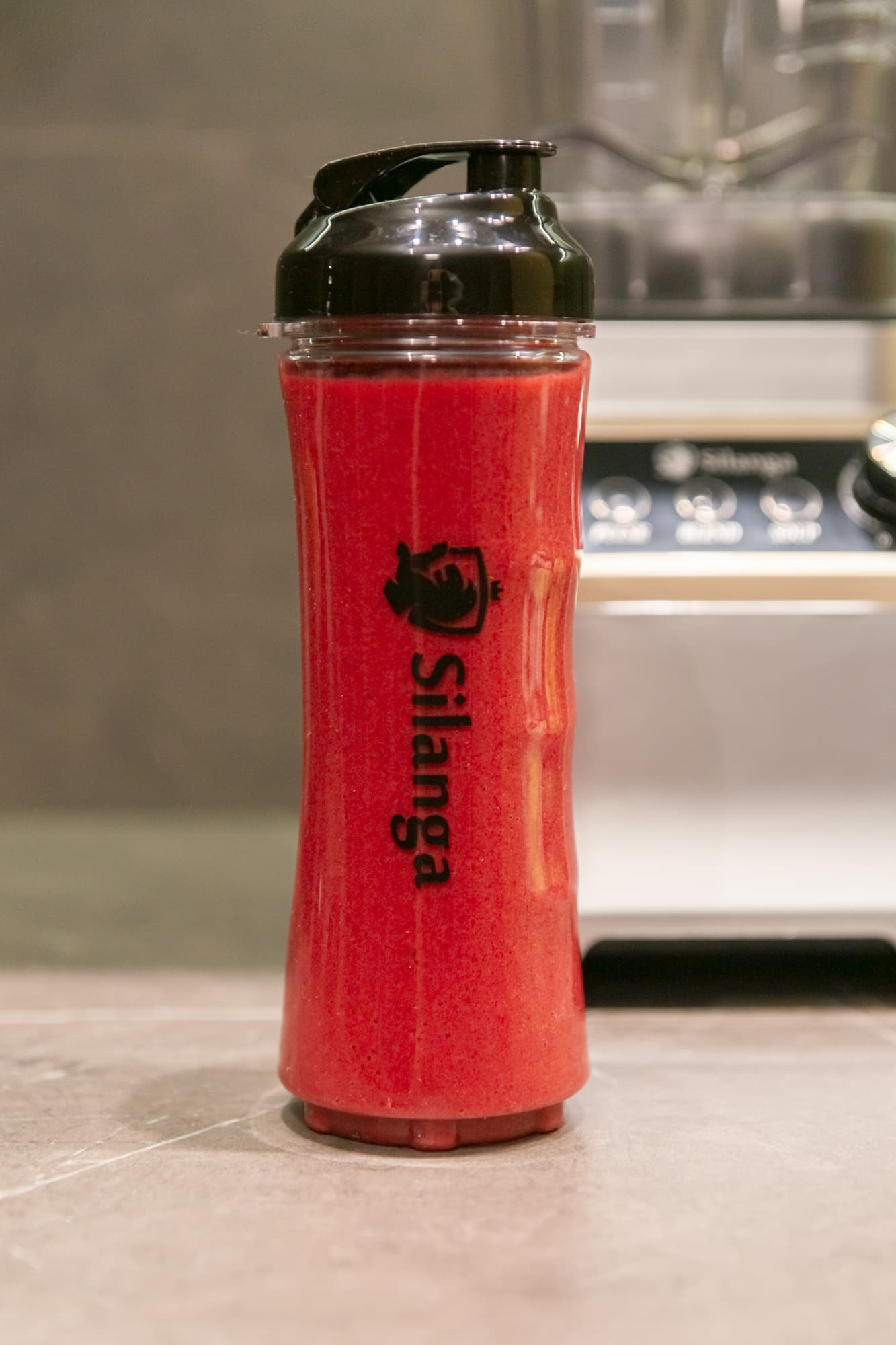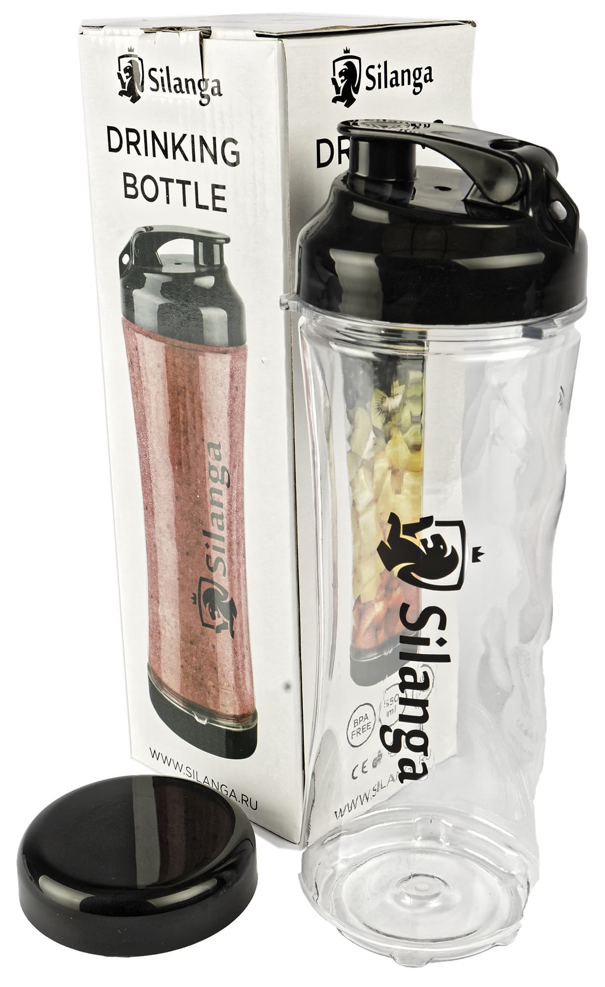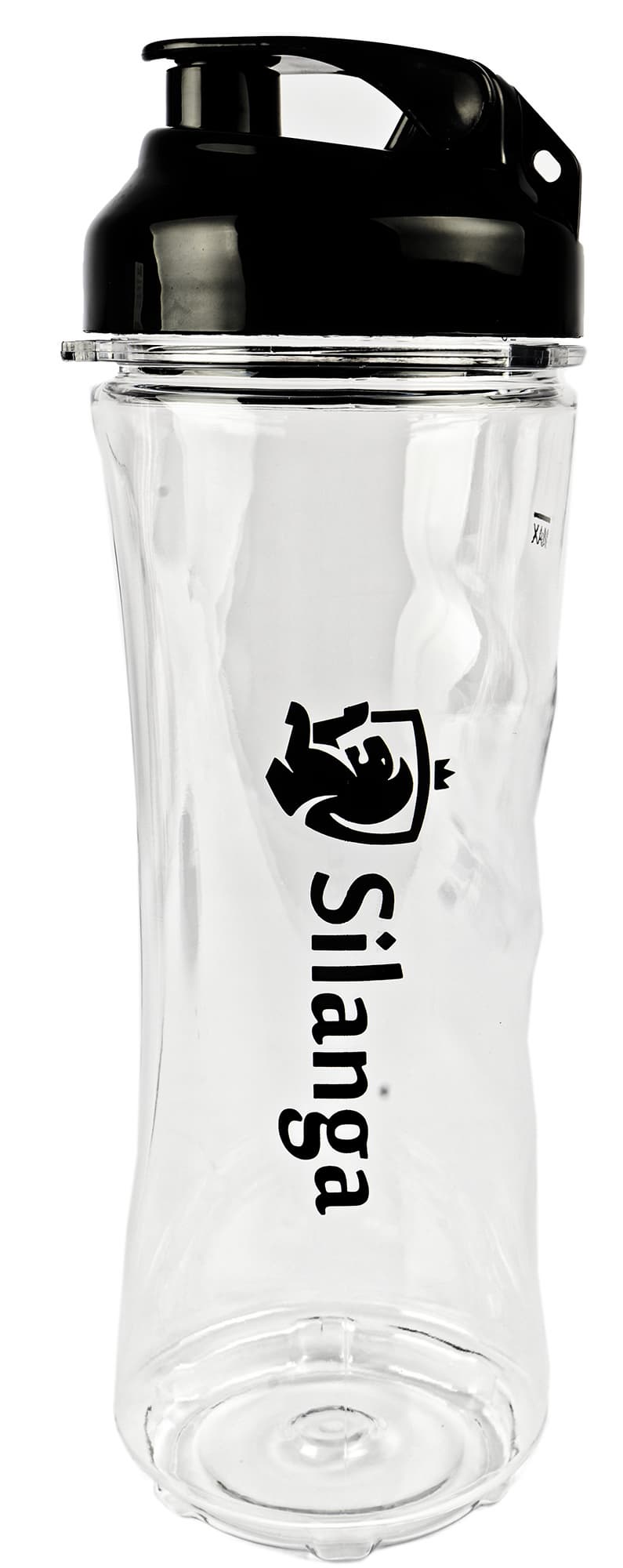Прозрачная пластиковая бутылка, позволяющая брать готовый продукт с собой, на тренировку или куда еще вздумается, также имеет классическую форму. Помимо большого логотипа, на бутылке есть отметка Max без указания точного объема. Поскольку бутылка универсальна и также используется как шейкер в модели Silanga BL550 Smoothie maker, эта отметка служит ориентиром при заполнении емкости ингредиентами для взбивания в объеме до 550 мл. При использовании изделия только в виде питьевой бутылки эту надпись можно игнорировать и наполнять емкость до краев — тогда в нее помещается до 600 мл. Бутылка изготовлена из прочного пластика, выдерживающего температуру жидкости до 60 градусов. Изделие высотой 23 см и диаметром 8 см весит всего 100 г.