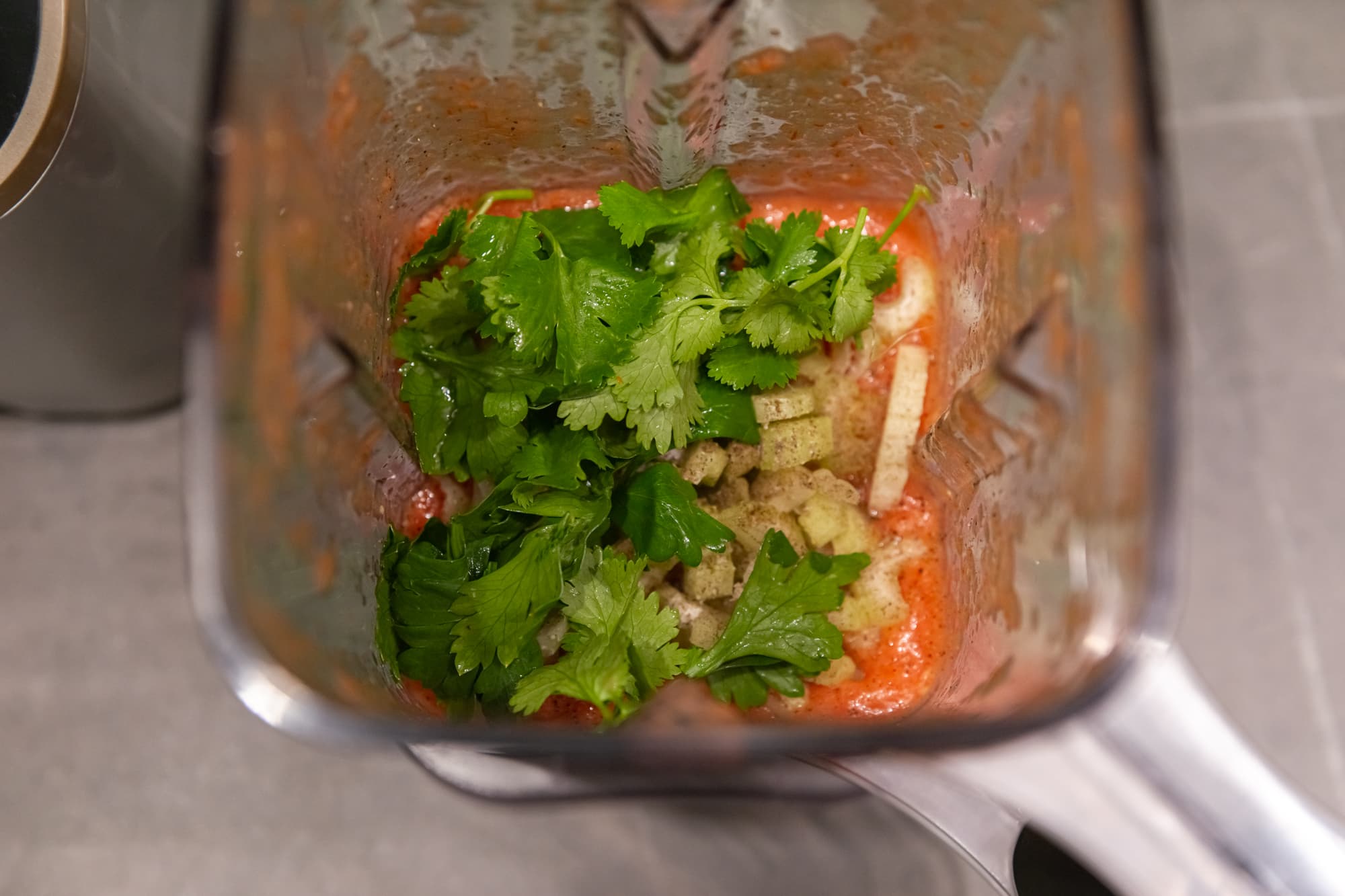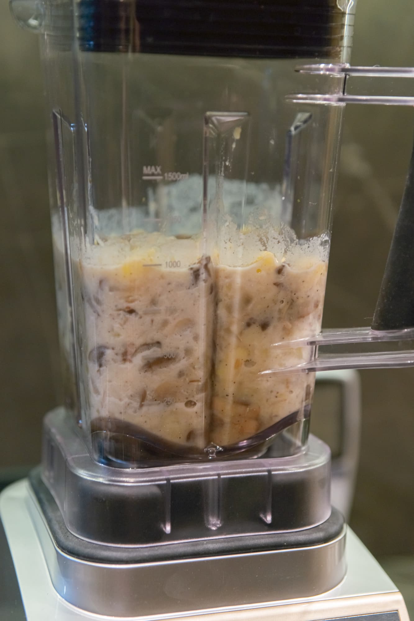 Дождавшись остывания супа до комнатной температуры переместили его в блендер, добавили 200 мл охлажденных сливок и запустили блендер на 3-й скорости. Ровно 8 рекордных секунд — и мы получили готовое блюдо!