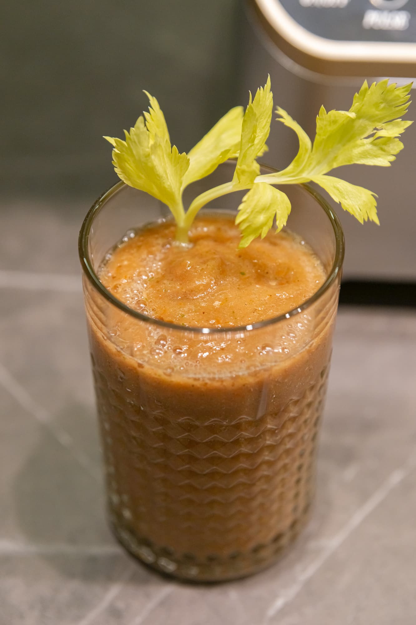 Добавили к томатам сельдерей, зелень, соль и включили прибор еще раз.