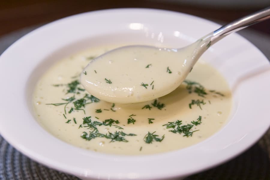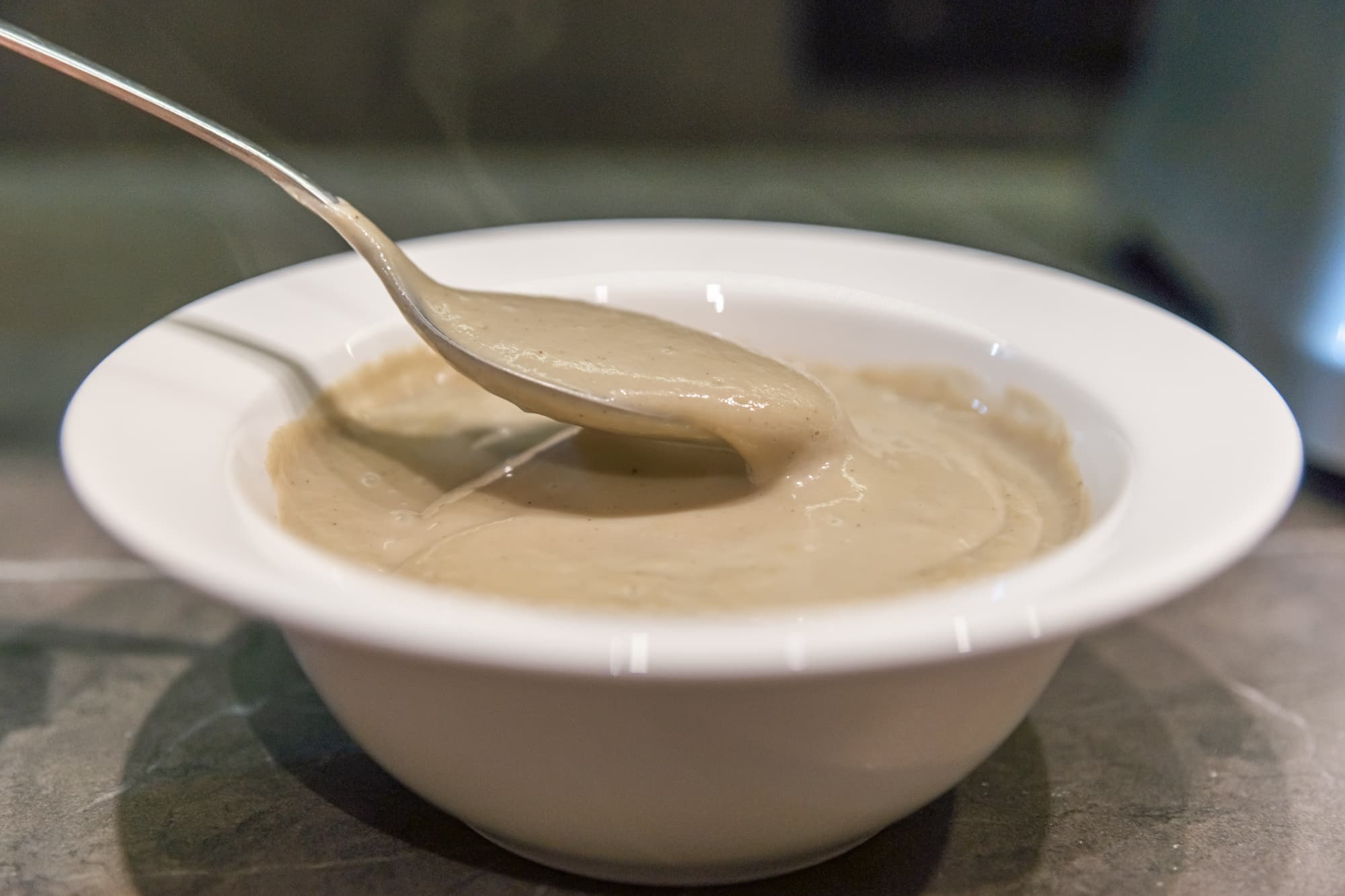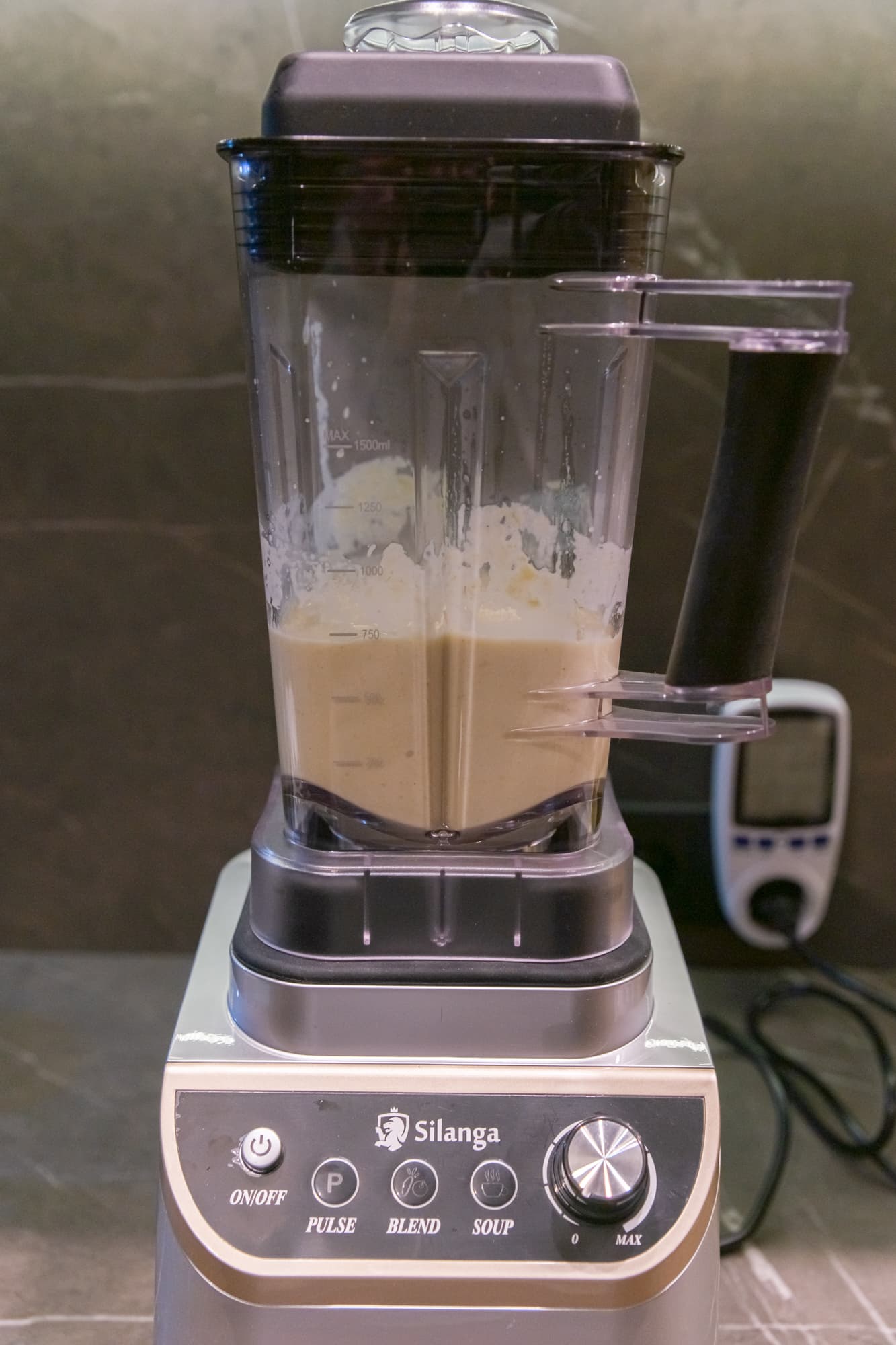 В этот раз мы решили задействовать автоматический режим Soup. Будущий суп, остывший до 25 °C, переместили в кувшин, положили туда же пару ломтиков сливочного масла и добавили холодные сливки.
