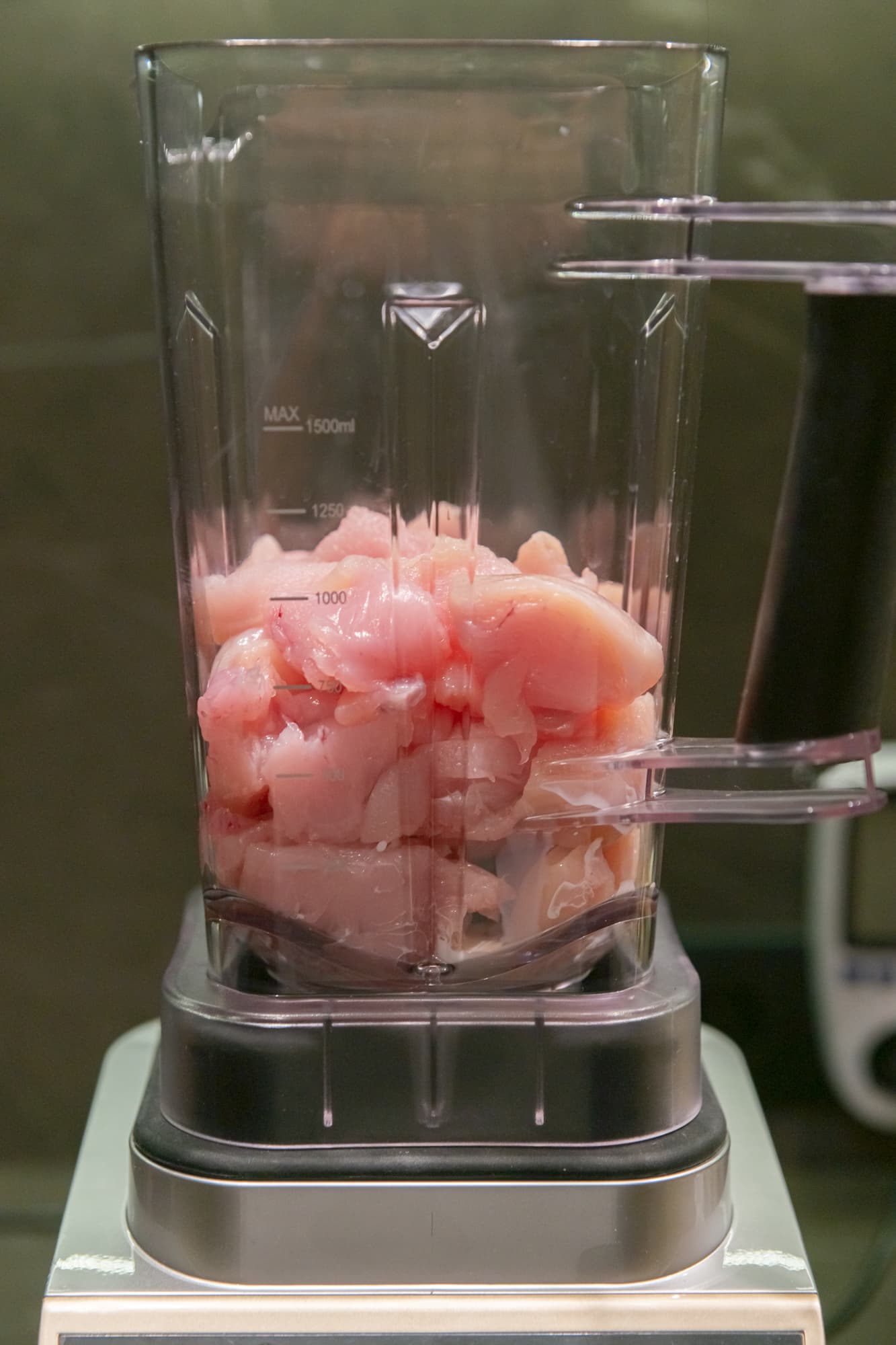 Вздумалось нам проверить Silanga BL1500 Pro на прочность. В инструкции, как мы помним, нас предупреждают о максимальном количестве загрузки мяса до 300 г. Мы рискнули поместить в чашу 850 г нарезанного куриного филе и запустили блендер.