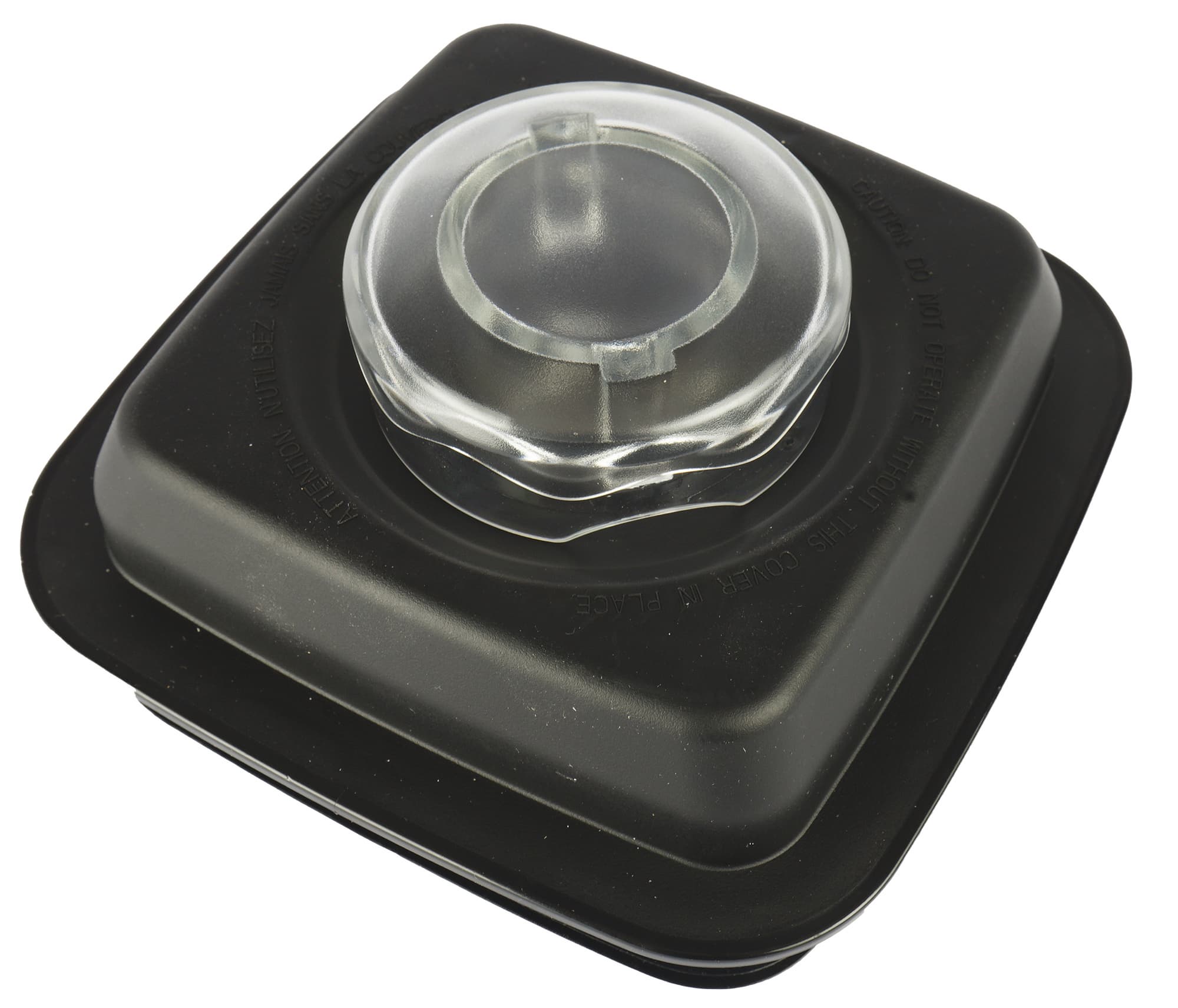 Массивная крышка изготовлена из плотной резины. Вставляется в кувшин просто — надавливанием сверху до упора. По центру имеется отверстие диаметром 4 см, которое можно использовать для добавления ингредиентов в процессе взбивания или для перемешивания их толкателем. Отверстие можно закрыть пластиковым стаканчиком-крышкой, которое фиксируется поворотом по часовой стрелке. Производитель называет эту деталь мерным колпачком, хотя никаких отметок объема на нем нет. Объем колпачка составляет 35-40 мл.