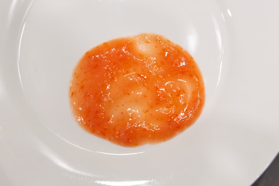 Томатное пюре воздушное и однородное, количество мелких фрагментов кожицы и семян минимальное.
