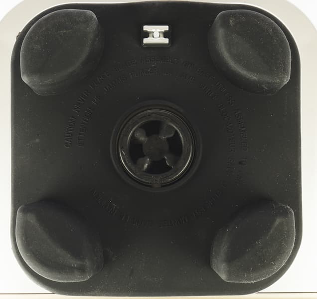 Площадка для установки кувшина представляет собой съемную резиновую накладку с четырьмя выступами высотой по 3 см, которые удерживают емкость на месте. Резиновый материал призван гасить излишние вибрации при работе устройства. Соединение базы с кувшином — металл/металл с резиновой прокладкой для снижения вибрации при работе прибора. Также, рядом, мы видим кнопку, не позволяющую включить прибор без установленного кувшина.