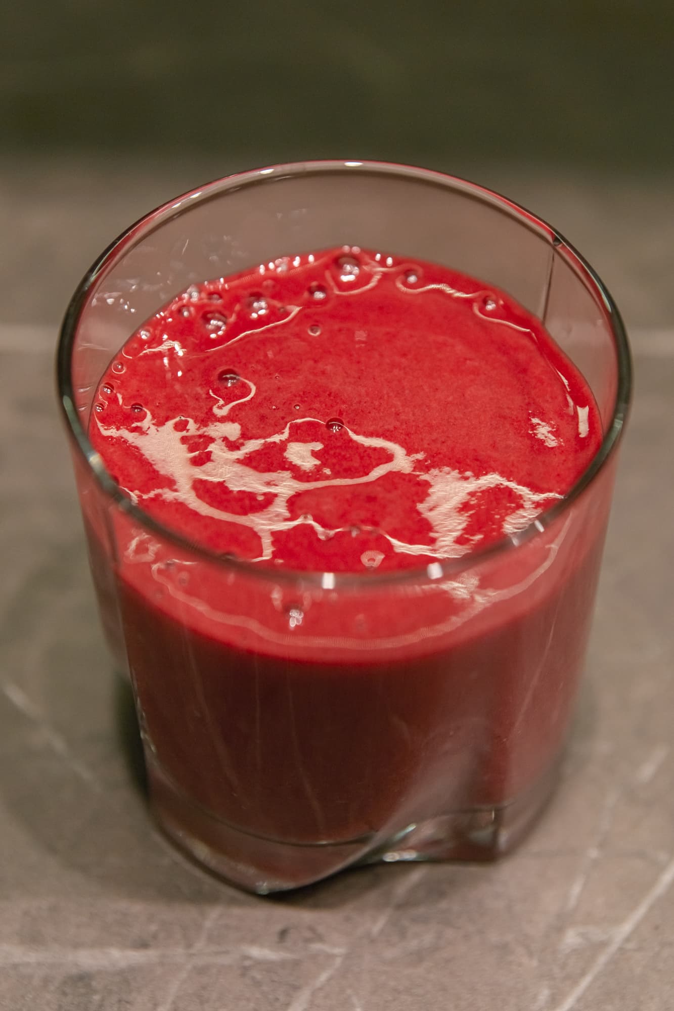 Напиток стал воздушным, без единого намека на кусочки вишен или банана. У нас получилось 750 мл смузи идеальной пышной консистенции.