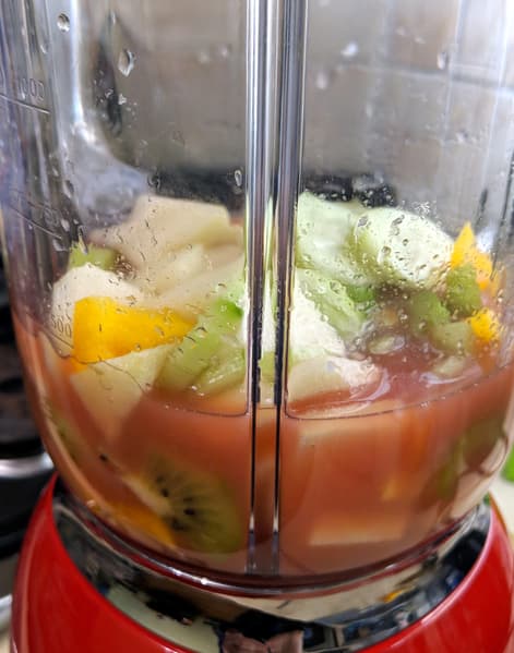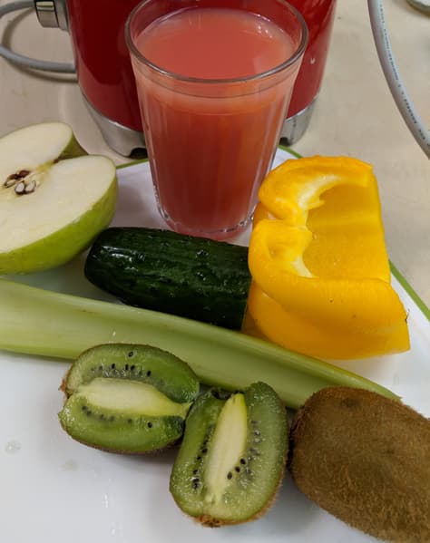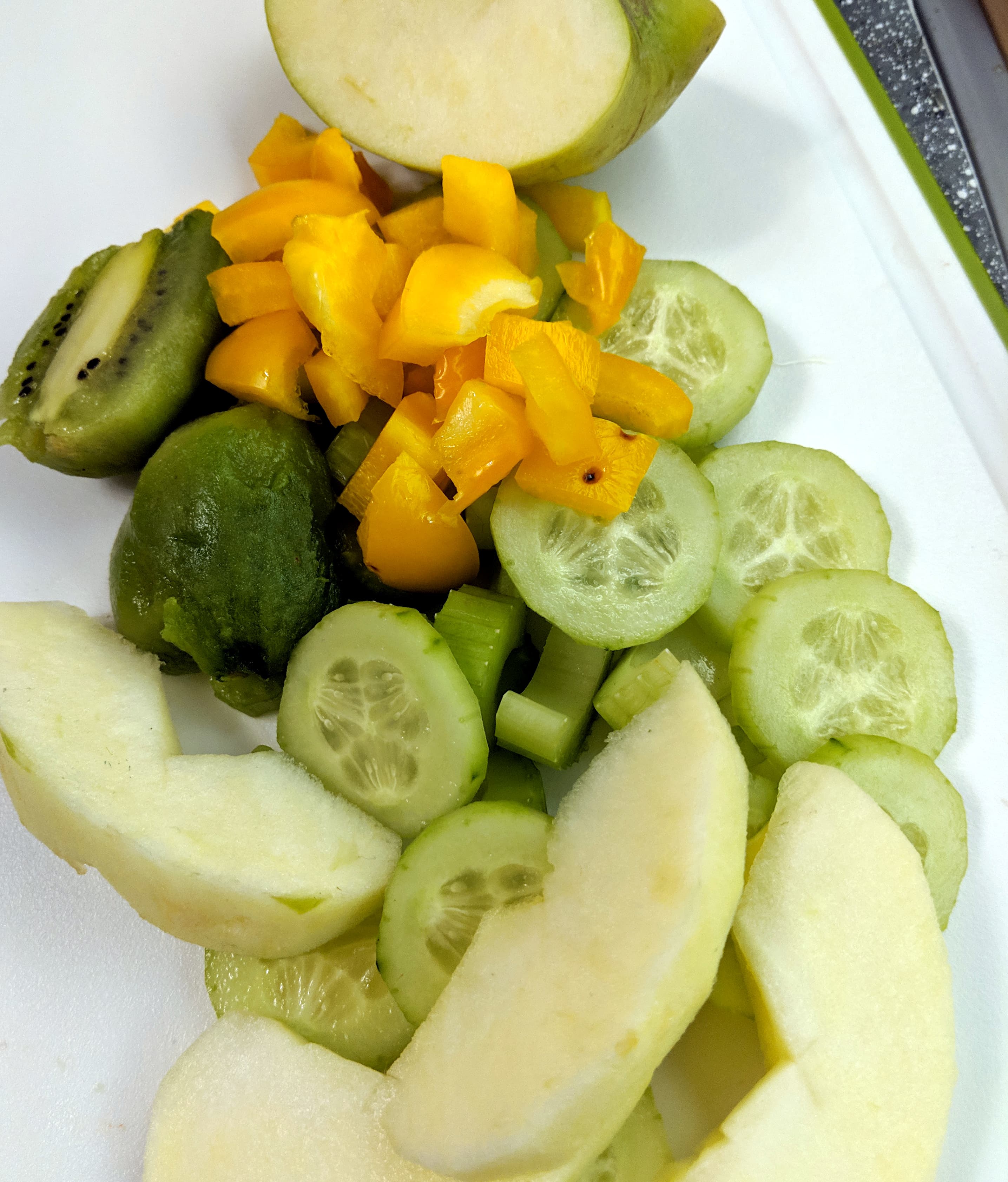 Для первой пробы смузи мы взяли рецепт с одного из кулинарных сайтов, где в грейпфрутовом соке рекомендовали размельчить стебли сельдерея, киви, яблоко, сладкий перец и огурец. Все фрукты-овощи обесшкурили, нарезали мелкими кусочками и сложили в сок.