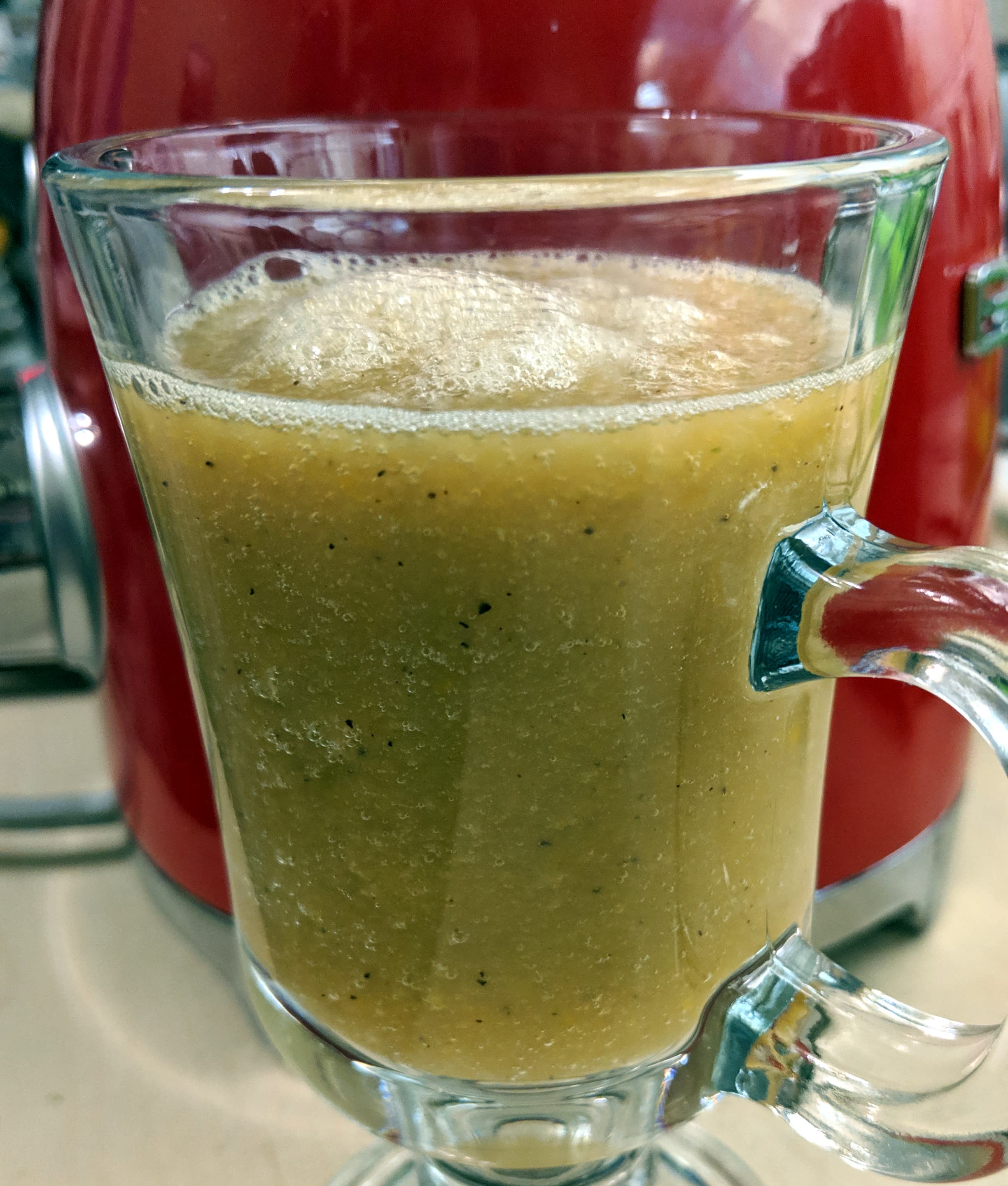 Минута на третьей скорости — и готово питье для любителя пряных вкусов. Мы не клали туда ни грамма перца, но сочетание грейпфрута и сельдерея дает коктейлю (или жидкому салату) невиданную остроту. Если будете пробовать — не забудьте слегка посолить.