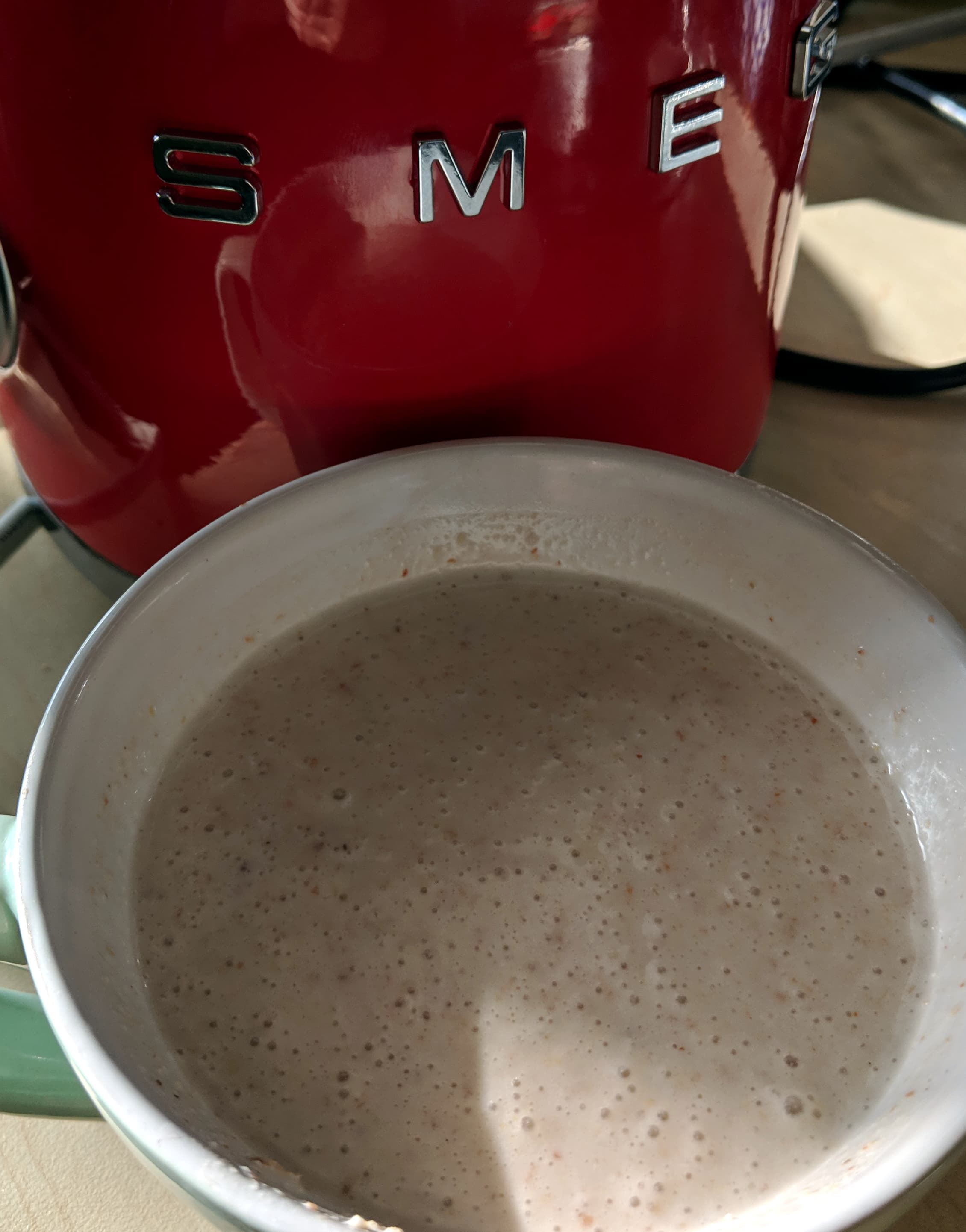 И то нам показалось, что последние секунд 15 были лишними. Томатное пюре получилось взбитым, насыщенным пузырьками воздуха и бледным, как пена.