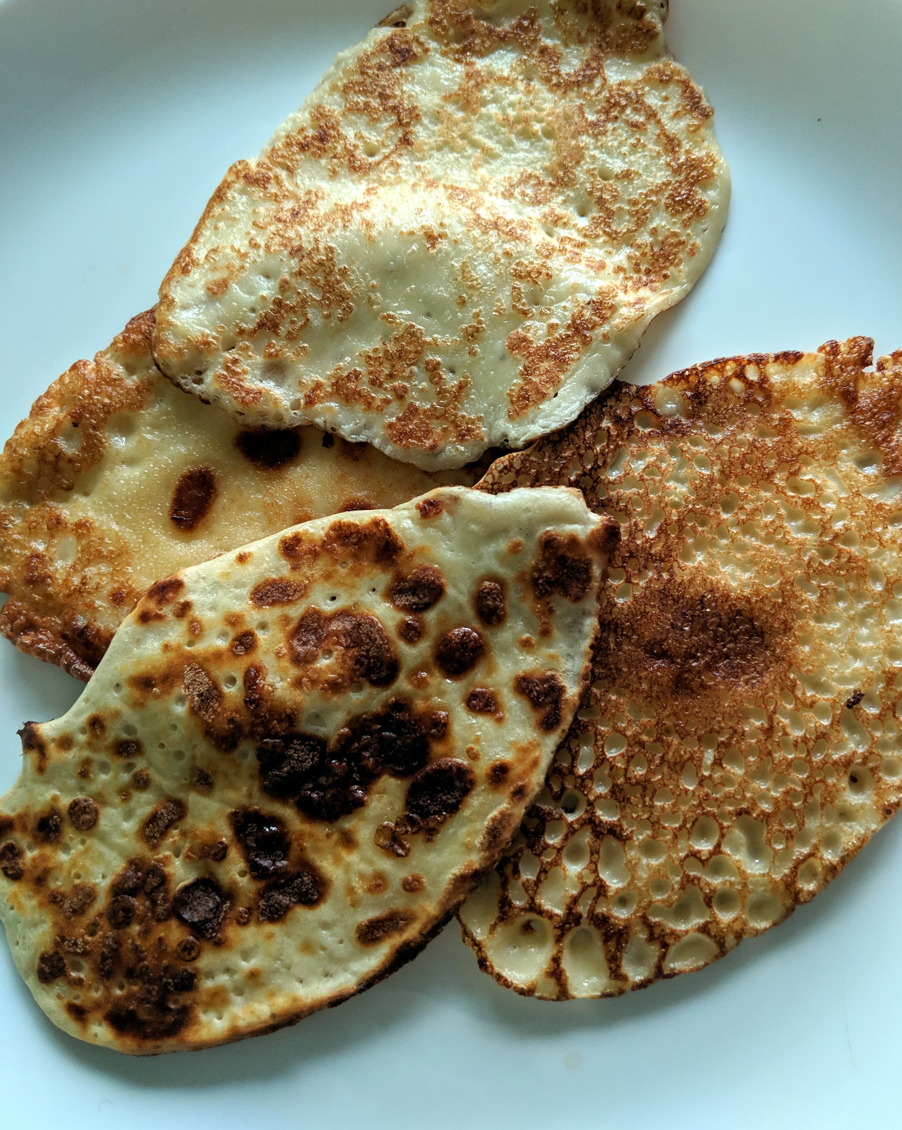 Выпекали мы мелкие блинчики на сковороде, смазанной небольшим количеством растительного масла. Воздуха в тесте после перемешивания было достаточно, чтобы сделать их пышными и нежными. Хотя без добавления разрыхлителя они становятся жесткими после остывания, и тут уж дело техники — напечь столько, чтобы на потом не осталось.