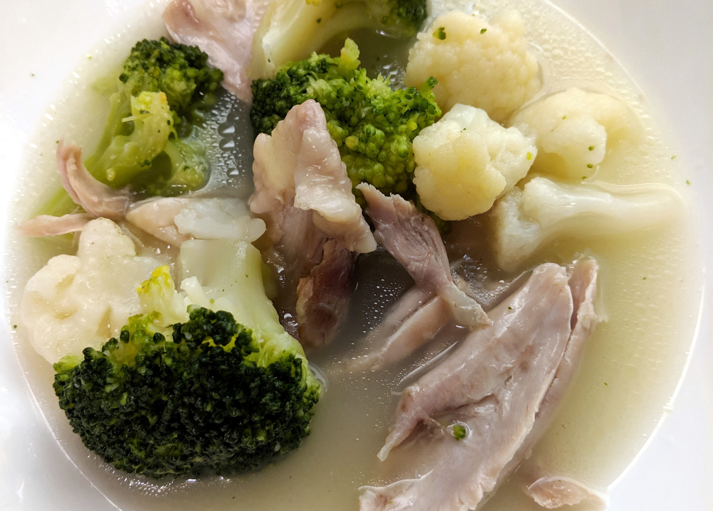 В небольшом количестве куриного бульона мы сварили несколько соцветий брокколи и цветной капусты. Немного охладили, так как производитель не рекомендовал измельчать горячее (чтобы не затупить ножи), влили в кувшин, где оставались наши взбитые помидоры. Туда же добавили вареное куриное мясо крупными кусками и измельчали на третьей скорости в течение 25 секунд.