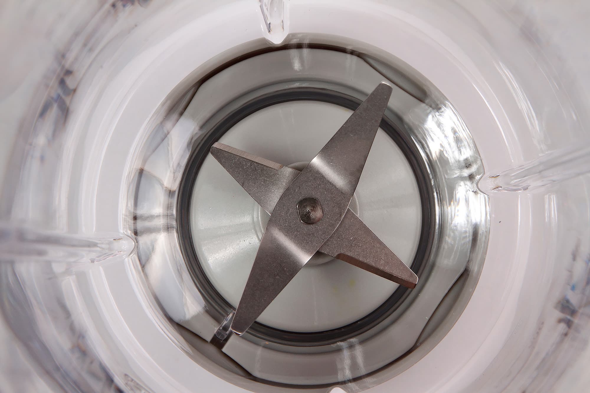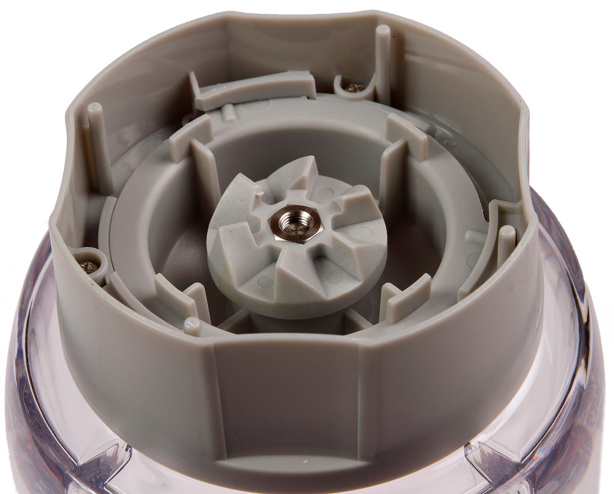 В идеально прозрачном кувшине из небьющегося, по рассказам производителя, пластика тритана располагается блок с ножами. Две лопасти слегка подняты и изогнуты, а две опущены — для лучшего измельчения. Ножи острые, ими вполне можно порезаться.