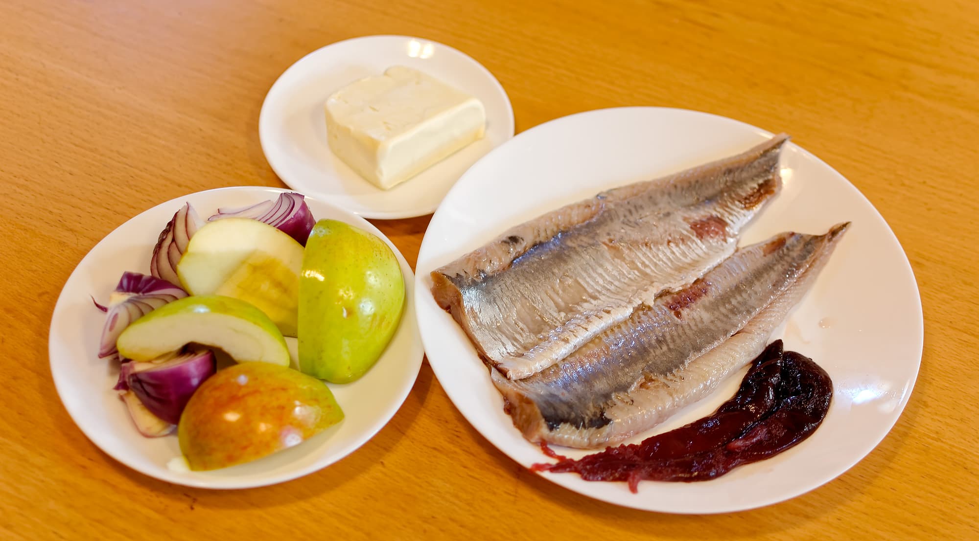 Еврейское блюдо на основе сельди. Также присутствуют сливочное масло, яблоки и лук.