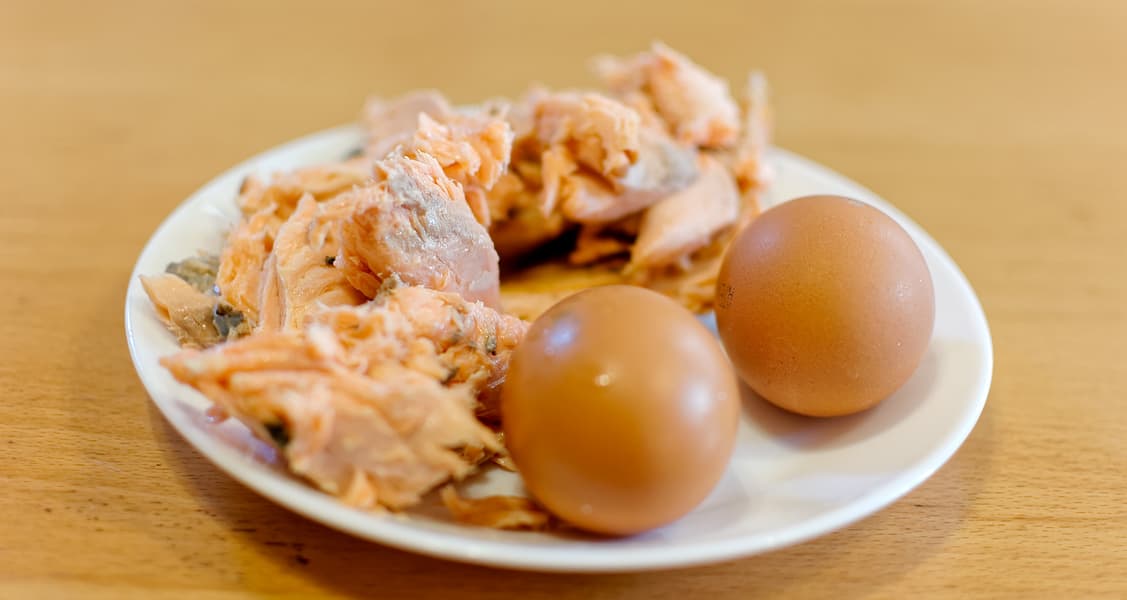 Традиционно этот французский паштет готовят из мяса, но и из рыбы никто не запрещает. В нашем распоряжении оказалось довольно большое количество запеченной семги, к которой мы решили добавить пару вареных яиц.
