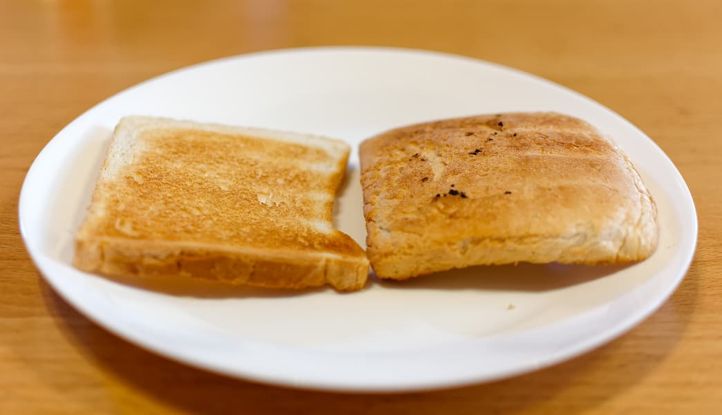 Белый хлеб для тостов, как и в прошлый раз, зажарился сильнее. Для него мы бы даже рекомендовали «троечку».