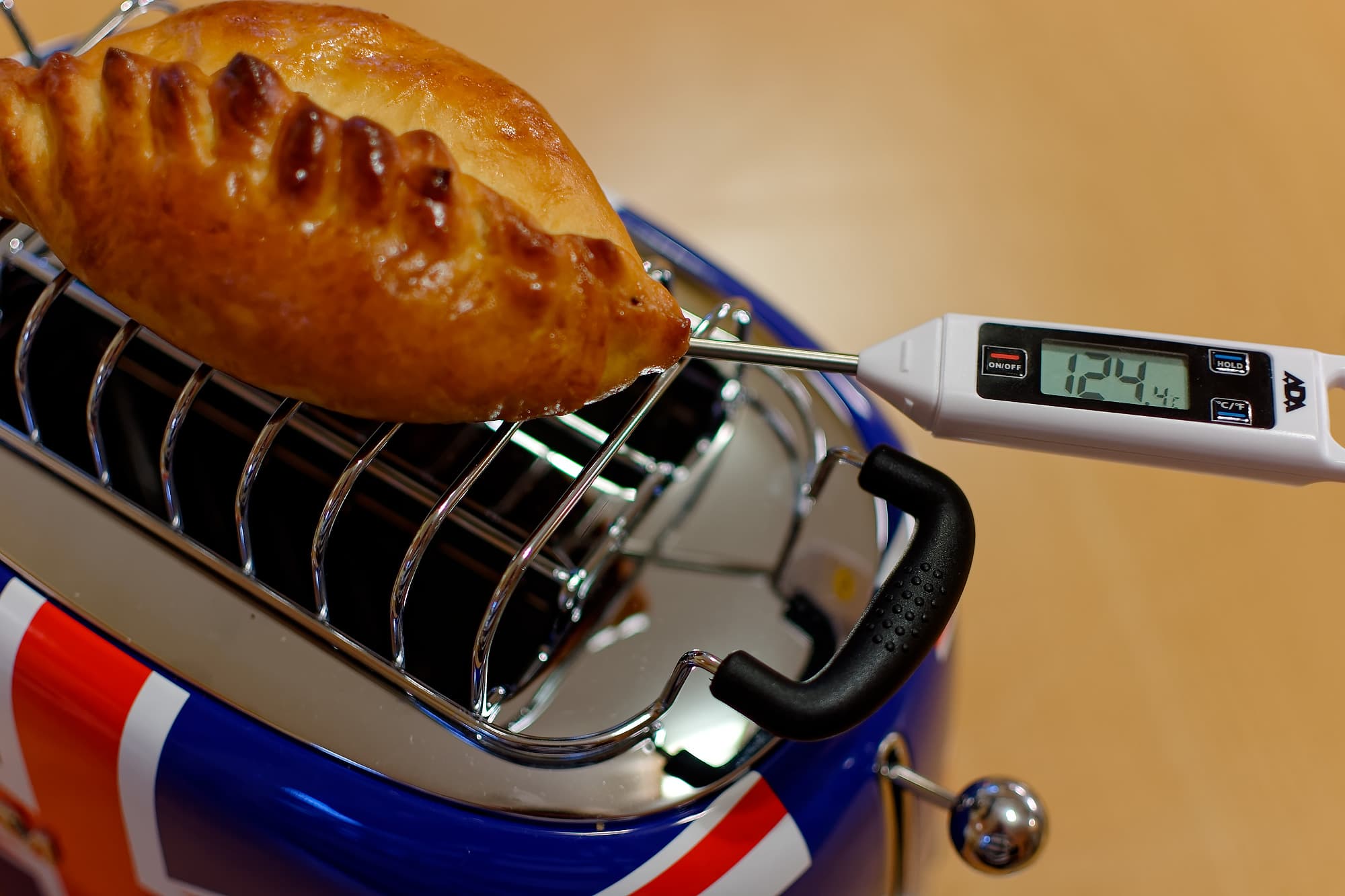 Мы засунули щуп кулинарного термометра примерно на половину высоты камеры для тоста, и, стараясь держать его ровно посередине, включили самую длинную программу (шестая степень прожарки). Температура на экране термометра росла постоянно, вплоть до выключения тостера, и под конец достигла ровно 250 °C.