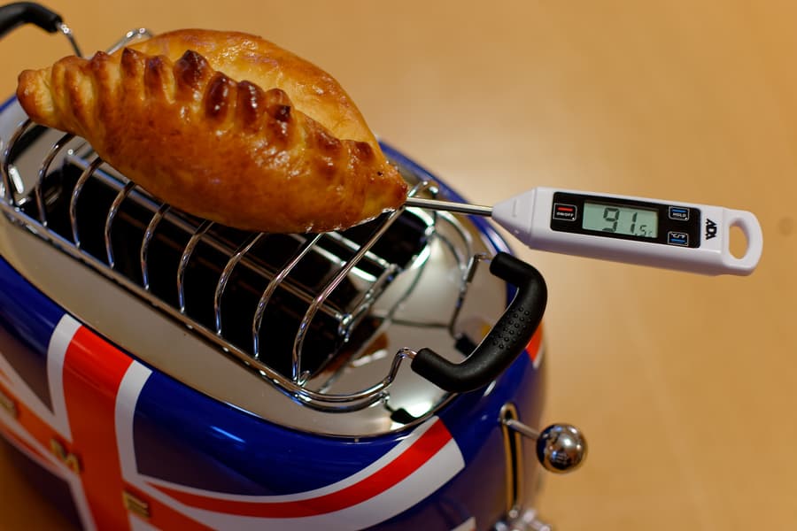 Выбрали режим «подогрев», под пирожок положили термометр. По окончании цикла температура под пирожком была 92 °C. Некоторое время после выключения она даже продолжала расти, но потом начала падать.