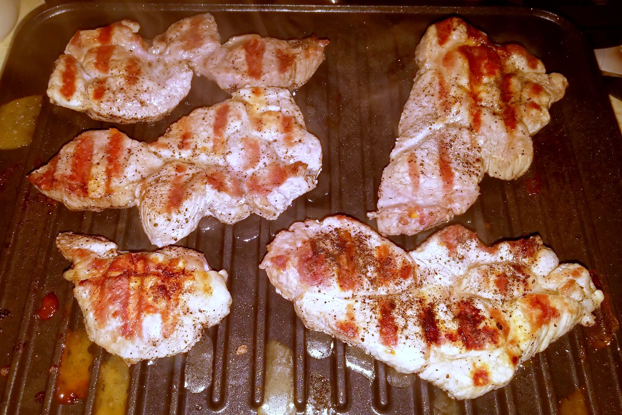 Данный рецепт требует предварительной подготовки: из соевого соуса, чеснока, имбиря, апельсиновой цедры и сока (для любителей погорячее также добавляется паста чили) мы приготовили маринад и оставили свинину в нем один раз на 2 часа и один раз на сутки. В обоих случаях мы промокнули мясо от излишков влаги и выложили на разогретый до максимальной температуры гриль (рекомендацию смазать панели растительным маслом мы все же не стали выполнять — иначе зачем антипригарное покрытие и жирная свинина?).