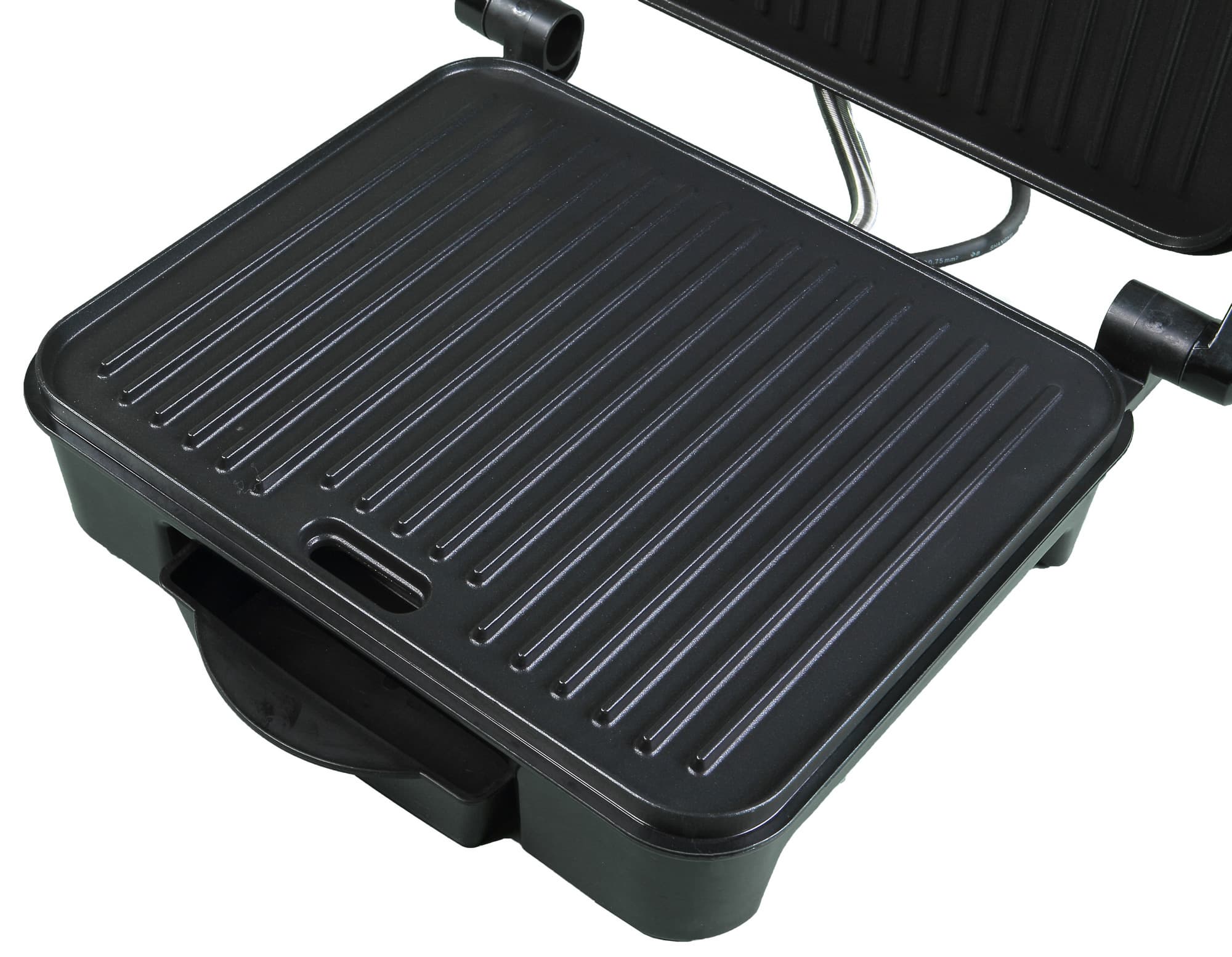 Дизайн корпуса гриля не выбивается из категории: стальные накладки на верхней части и ручке сочетаются с матовым черным пластиком. Ручка сильно выдается вперед корпуса, что повышает его габаритность на кухне. Поддон для сбора жира — это пластмассовая прямоугольная чаша, которая ставится по центру переднего края прибора и никак не фиксируется там.