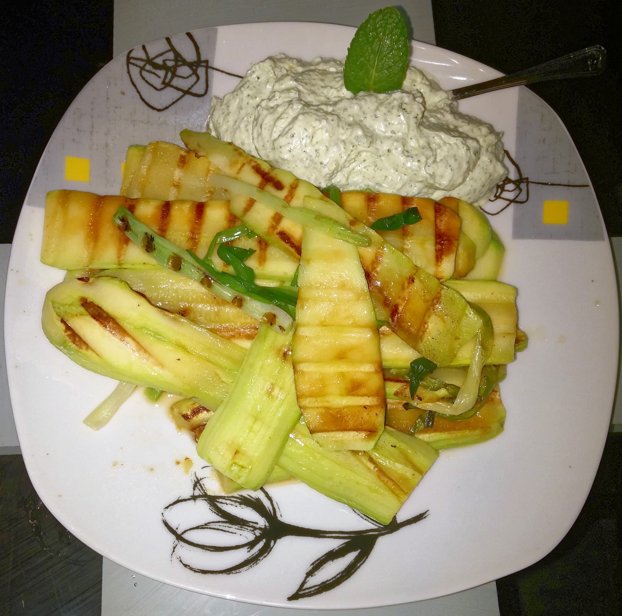 Однако изюминку овощам придал простой и элегантный соус из листьев мяты, сока и цедры лимона и сыра фета. Масло в соусе мы решили минимизировать, поскольку он и так был вкусный и густой, а кабачки при жарке впитали достаточно масла. Результат превзошел ожидания!