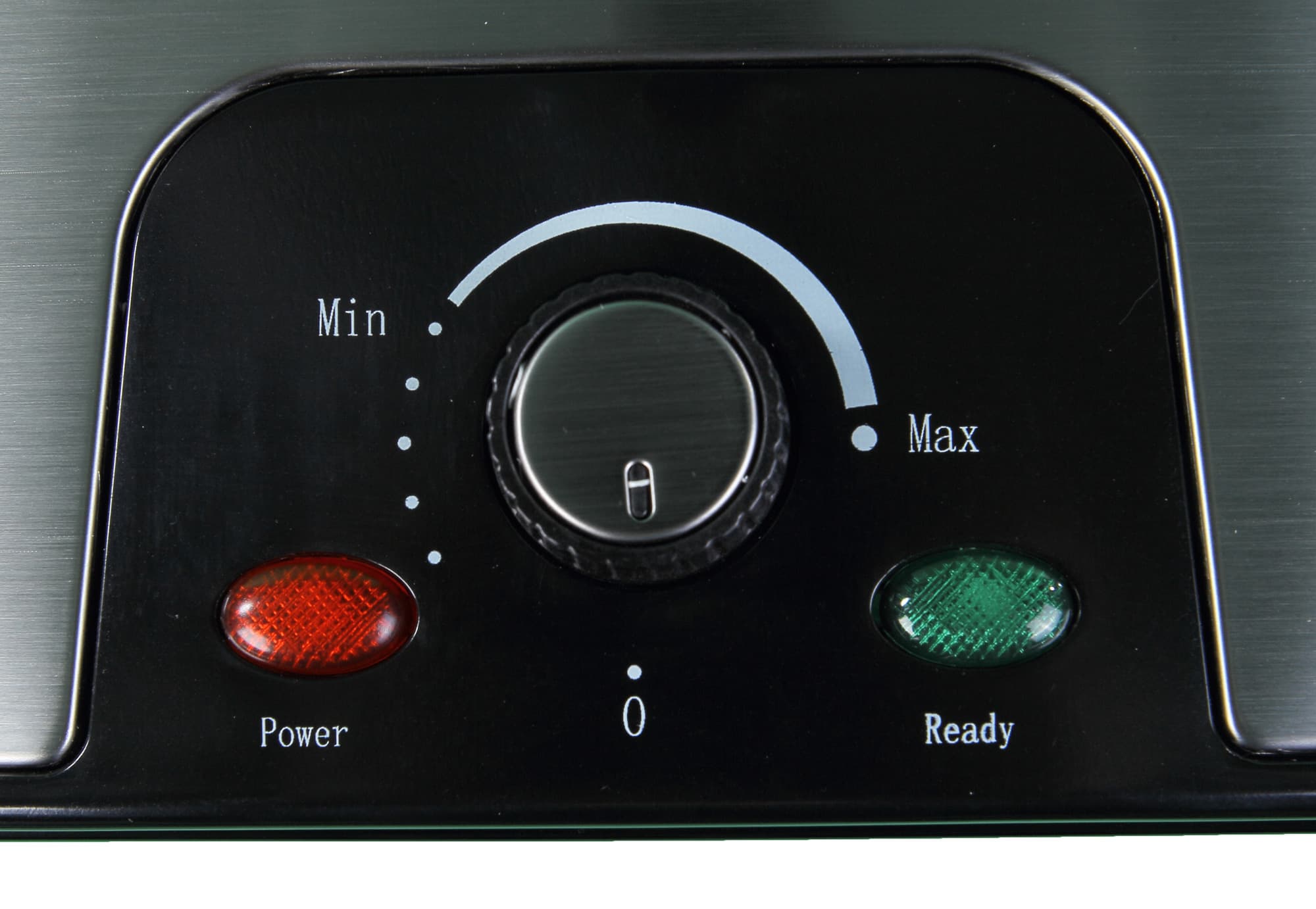 Регулятор работы плавно переводит прибор из положения 0 к рабочей температуре в диапазоне от 65°С до 200°С. При включении в сеть загорается красный индикатор питания (Power), звуков в гриле не предусмотрено. После установки регулятора на выбранную интуитивно температуру (на приборе нет цифровых подсказок) загорается зеленый индикатор нагрева (Ready); его выключение означает, что панели гриля достигли заданной температуры.