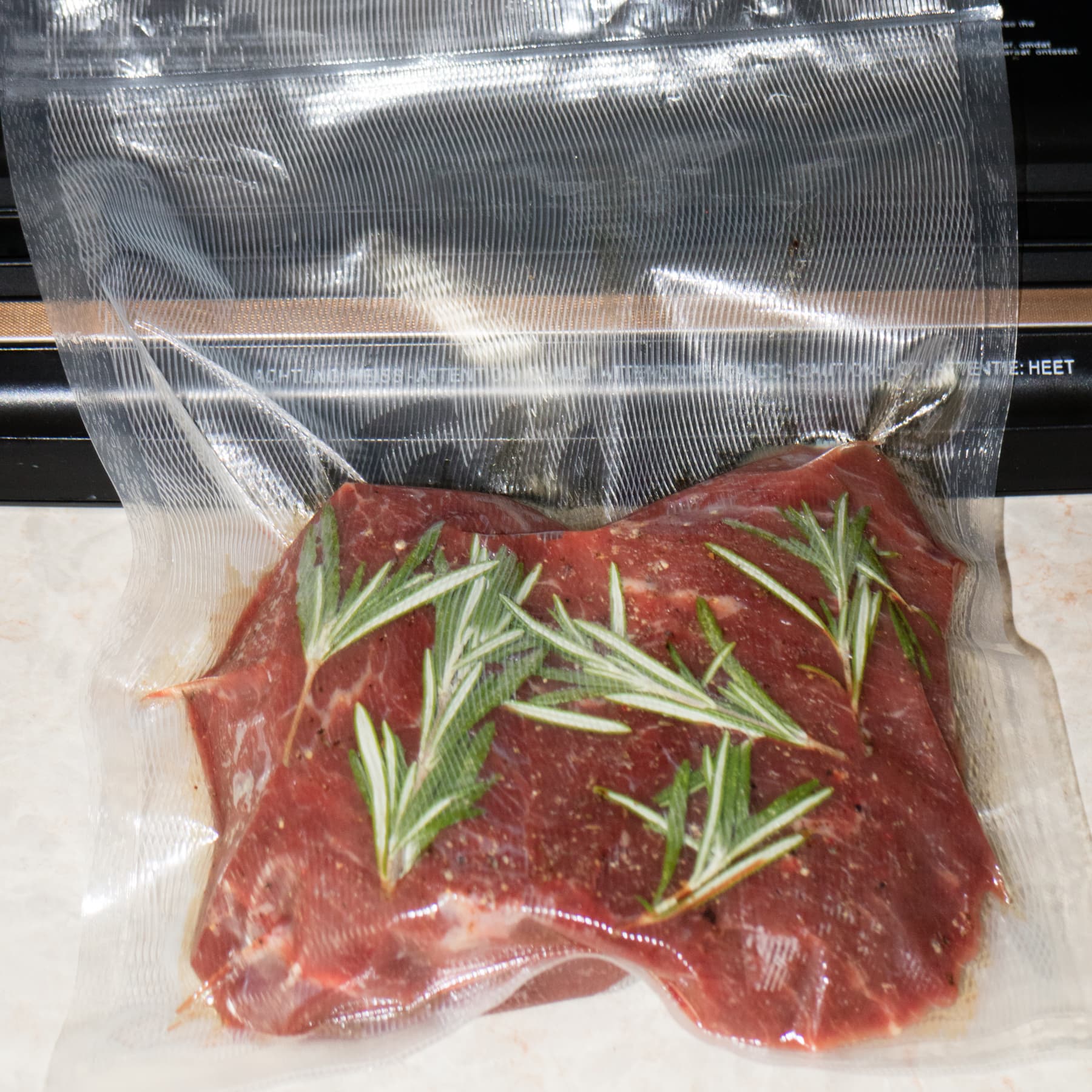 Не секрет, что длительная низкотемпературная варка облагораживает даже самую непримечательную говядину. Для данного теста мы взяли отруб, предназначенный для фарша, отрезали по возможности ровные кусочки, очистили от жил. Поперчили, с двух сторон обложили розмарином и завакуумировали.