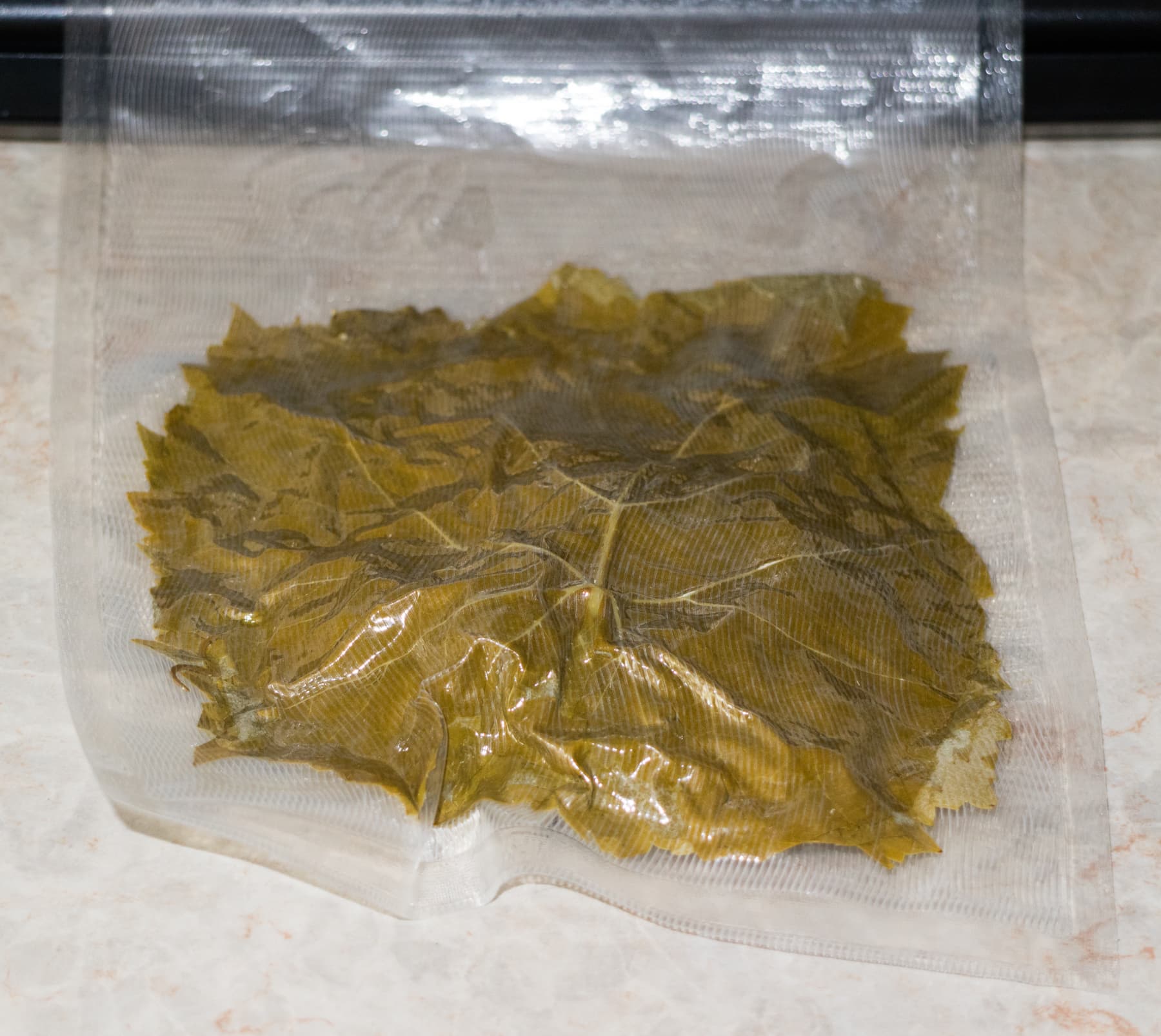 После изготовления долмы у нас осталась половина упаковки неиспользованных виноградных листьев. Заморозка может сказаться на них не лучшим образом, солить нам тоже не хотелось. Т. к. листья уже были спрессованы, да и в дальнейшем от них не требуется идеального сохранения формы, было решено воспользоваться вакууматором для сохранения свежести зелени. Упаковку производили в автоматическом режиме. Напомним, что по умолчанию вакуумируются сухие продукты.