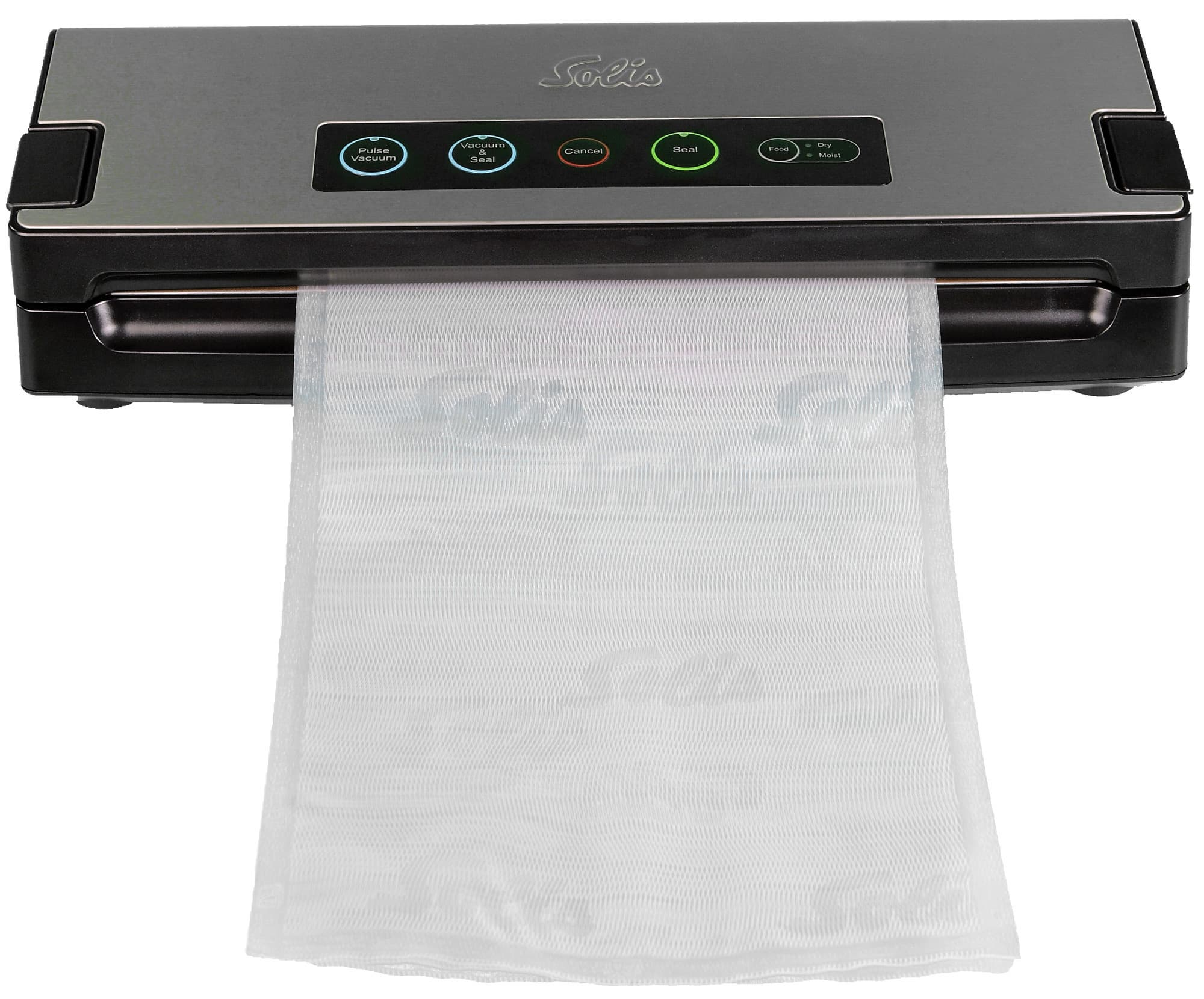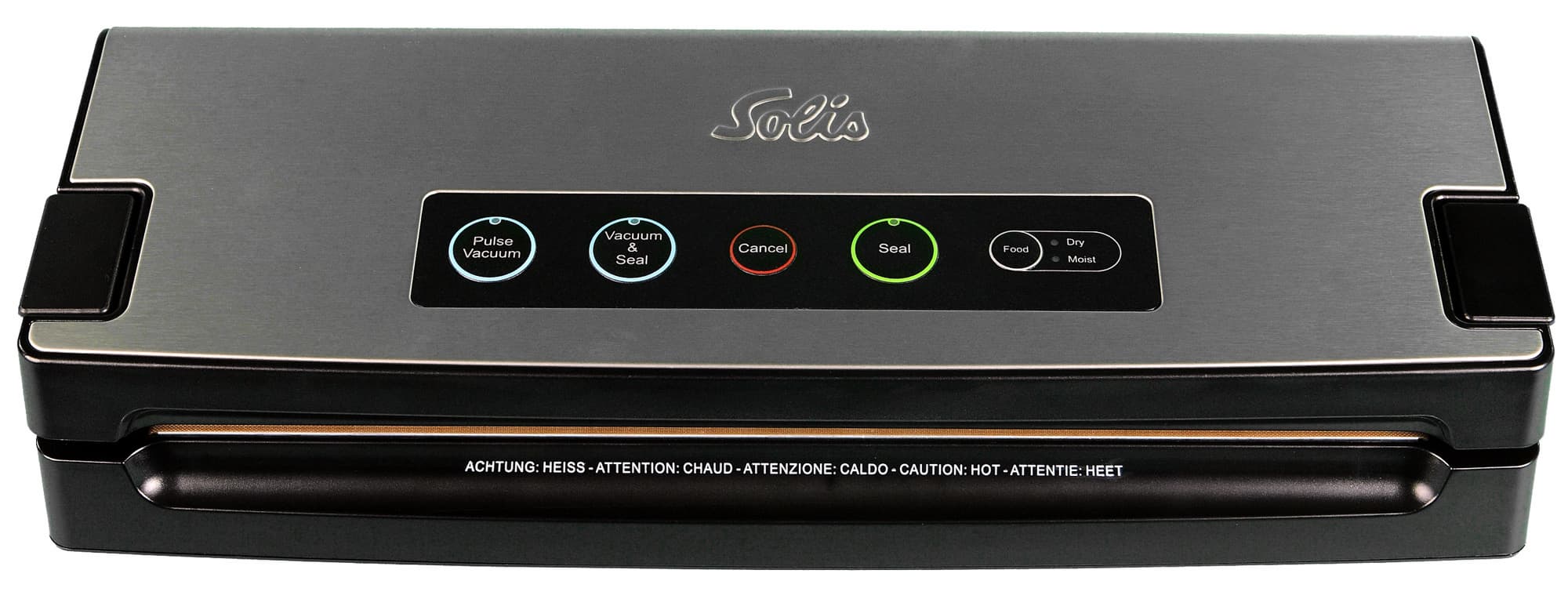 Solis Vac Premium — без сомнений отличный прибор для домашнего вакуумирования. Внешне аппарат выглядит благородно: простая геометрия, небольшие габариты, неяркие цвета, матированная нержавеющая сталь, на которой не остается следов от пальцев. Вакууматор удобно хранить, уложив его на бок и свернув шнур в специально отведенный отсек. С управлением и уходом никаких сложностей не возникает.