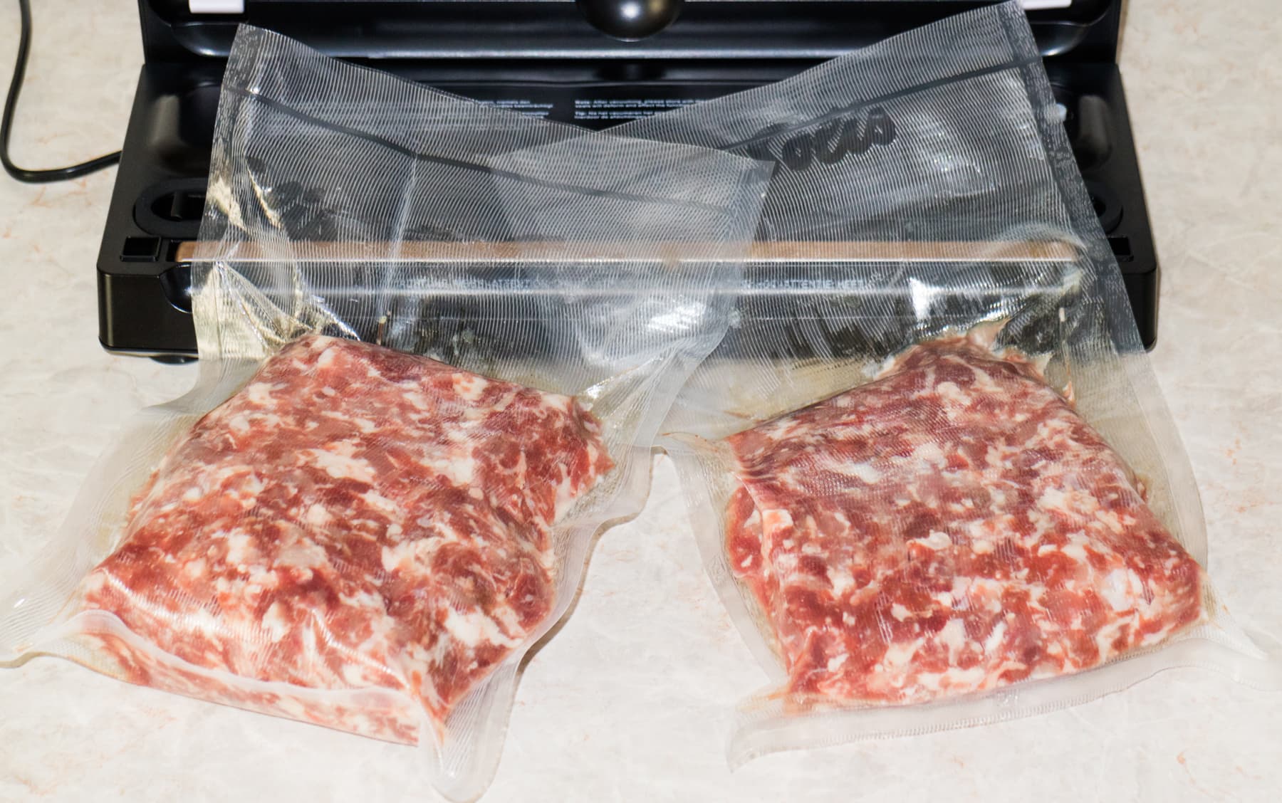Вакуумная упаковка продуктов для длительного хранения в морозилке предотвращает появление ожога от заморозки. После тестирования мясорубки нам понадобилось заморозить около полутора килограммов фарша. Мы разделили это количество на две части, сформовали из них более или менее ровные шарики и уложили в пакеты.