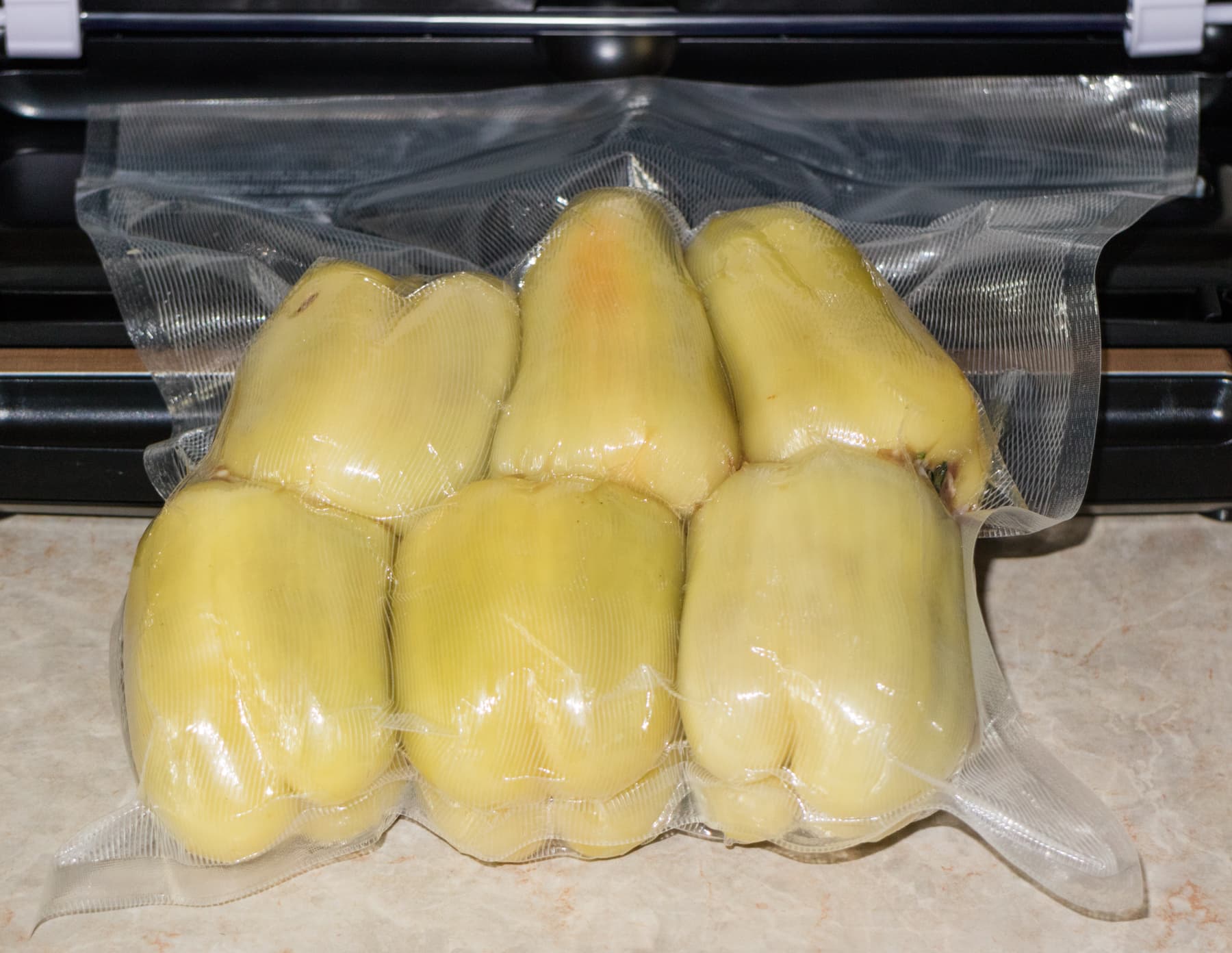 К этому моменту стало понятно, что работать с Solis Vac Premium легко и приятно. Упаковка перцев нас интересует лишь с точки зрения сложной геометрии продукта в пакете. Т. е. нам любопытно, насколько хорошо насос откачивает воздух изо всех углов пакета и между отдельными частями продуктов.