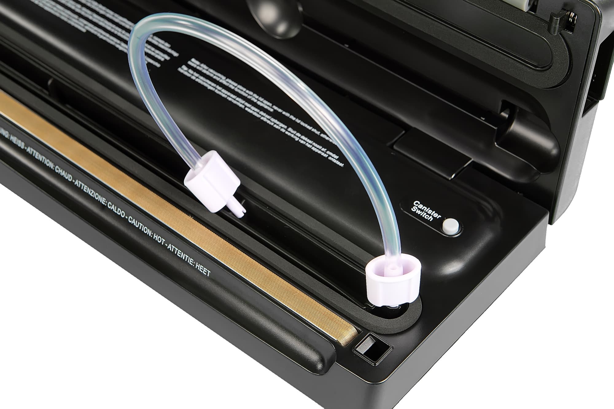Вакуумирование контейнеров происходит еще проще: нужно вставить один конец вакуумной трубки в предназначенное для этого отверстие на корпусе, другой конец — в крышку контейнера и нажать кнопку Canister Switch.