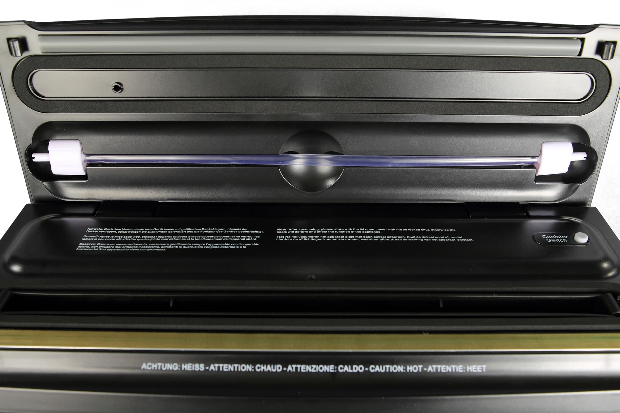 С правой стороны нижней части вакууматора расположена кнопка Canister Switch — переключатель, запускающий откачку воздуха из контейнера. Чуть ближе к краю расположена камера вакуумирования с размещенным внутри поддоном для сбора жидкости и отверстием для откачивания воздуха. Ближе всего к краю находится запаивающая планка с тефлоновым покрытием.