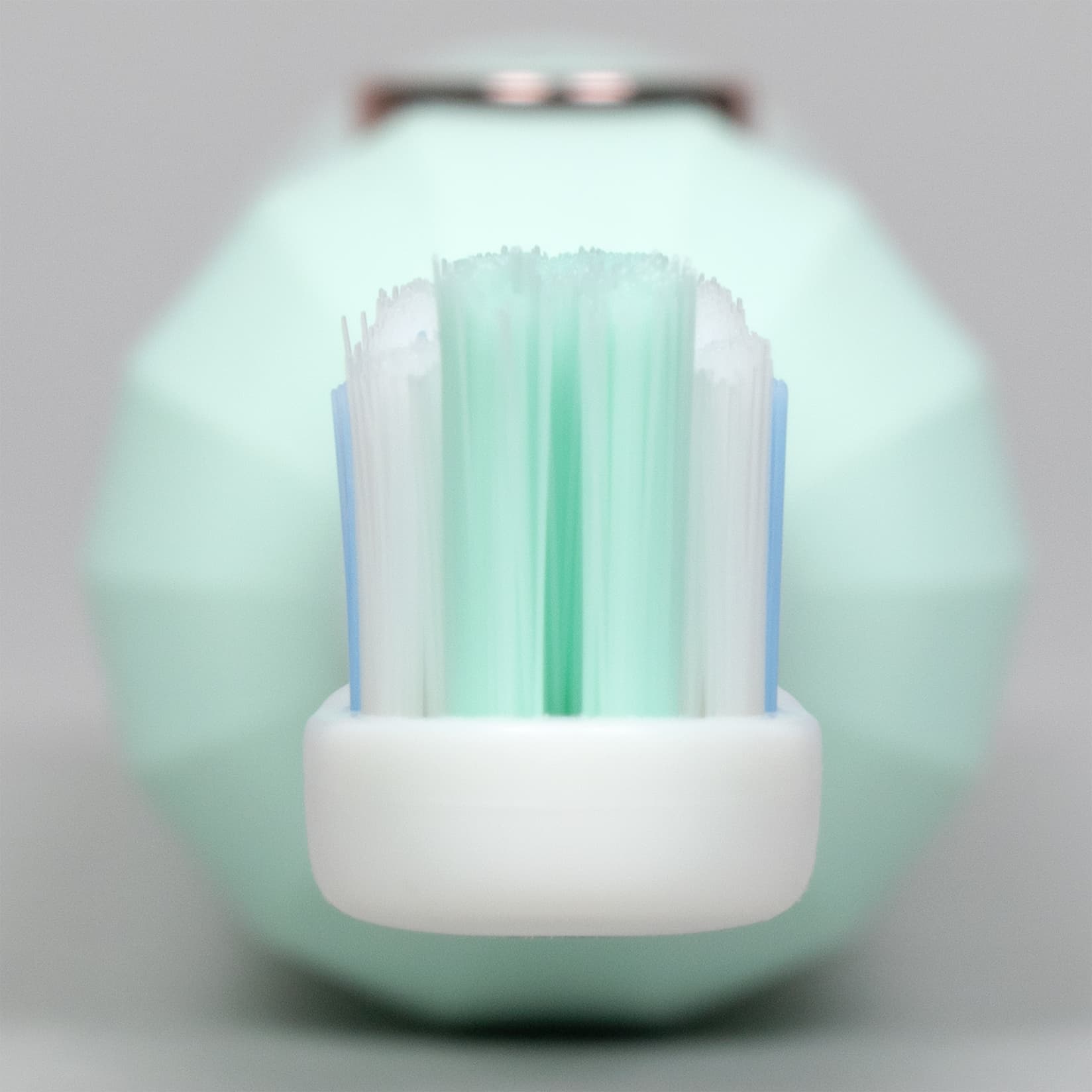 Геометрия пучков у оказалась различной. Помимо этого насадки можно различить по цвету щетины: у мягкой она бело-зеленая, у среднежесткой — с добавлением голубого. Никаких электронных приспособлений, вроде микрочипов, определяющих «пробег», у насадок нет. Время замены производитель рекомендует определять по обесцвечиванию волосков.