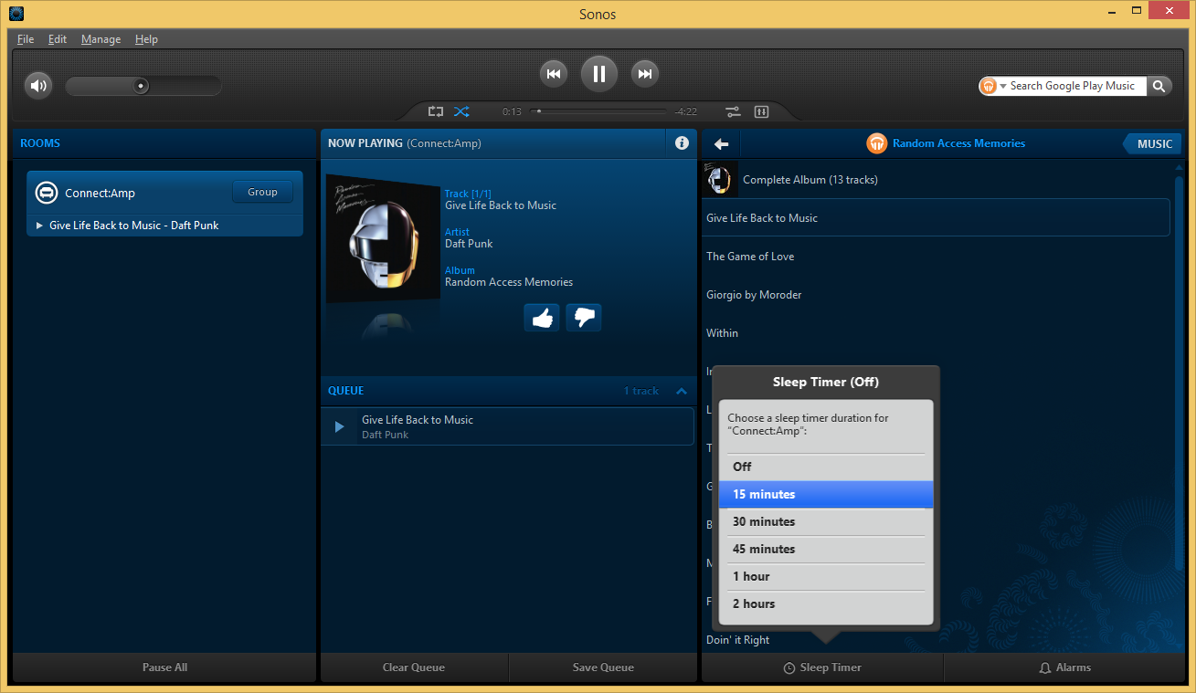 Программа управления позволяет использовать различные режимы воспроизведения и составлять плейлисты. Предусмотрено также одновременное выключение всех устройств в сети.