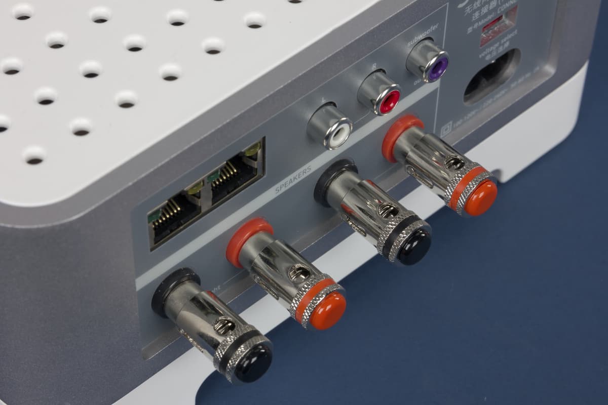 Все подключения осуществляются с противоположной стороны. Здесь находятся два сетевых порта со встроенными индикаторами, дополнительный аналоговый стереовход, выход на активный сабвуфер, вход сети питания с переключателем напряжения и универсальные выходы для акустических систем (в них можно подключать как просто зачищенный кабель, так и стандартные «banana jacks», отверстия для которых закрыты на заводе заглушками).