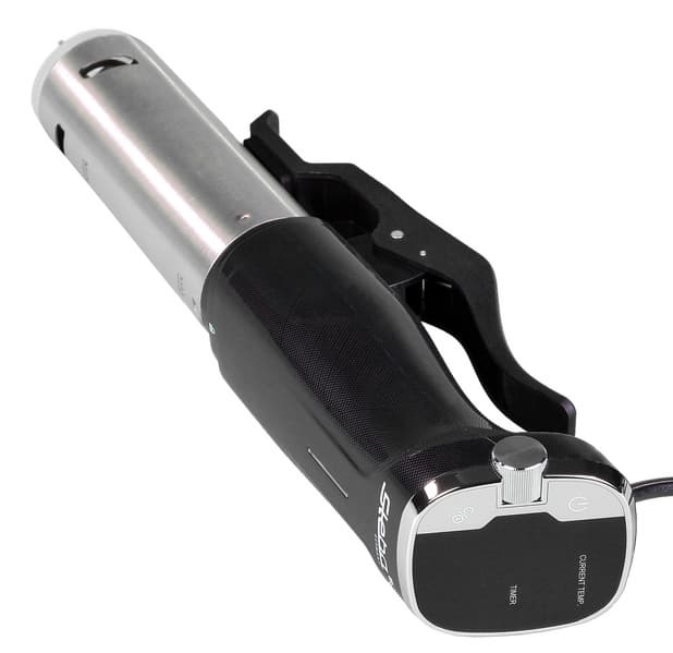 Steba SV 50 в полной мере удовлетворяет этим требованиям: компактный прибор отличается большой точностью контроля температуры (до 0,1-0,2 °C). Управление прибором очевидно и интуитивно. Мощный винт поддерживает равномерную циркуляцию и нужную температуру по всему объему воды. По уровню шума мы можем сравнить его с самыми тихими вентиляторами, то есть работает он почти беззвучно.