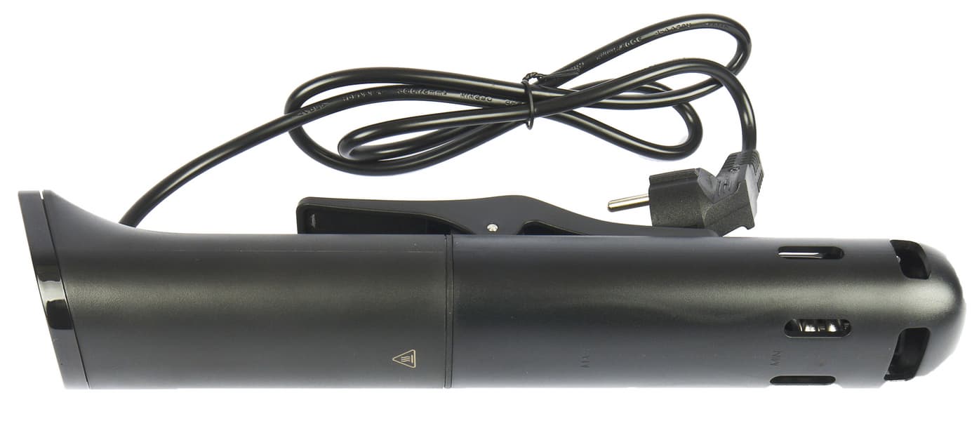 Данное устройство представляет собой вполне классический погружной су-вид. Прибор сделан в виде прищепки, нижнюю часть которой погружают в чашу с водой, а верхнюю часть крепят к чаше. На корпусе прибора расположена панель управления, с помощью которой можно установить температуру в диапазоне от 25 до 90 градусов с шагом 0,1 °C и время приготовления до 59 ч 59 мин.