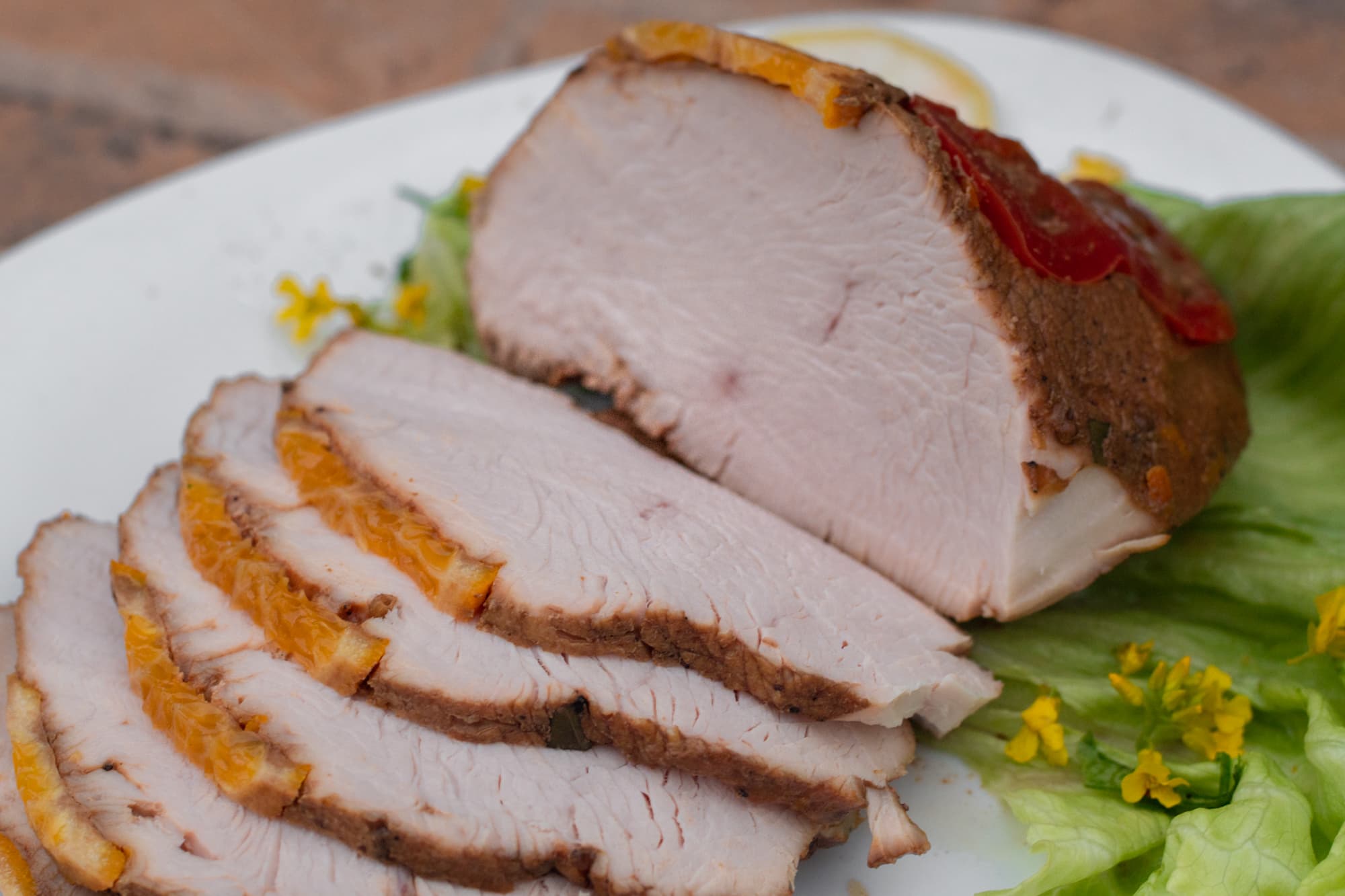 ...а также классическую ветчину из индейки вместе со сливочным маслом, маринадом из соевого соуса и специями (67 °C на 8 часов).
