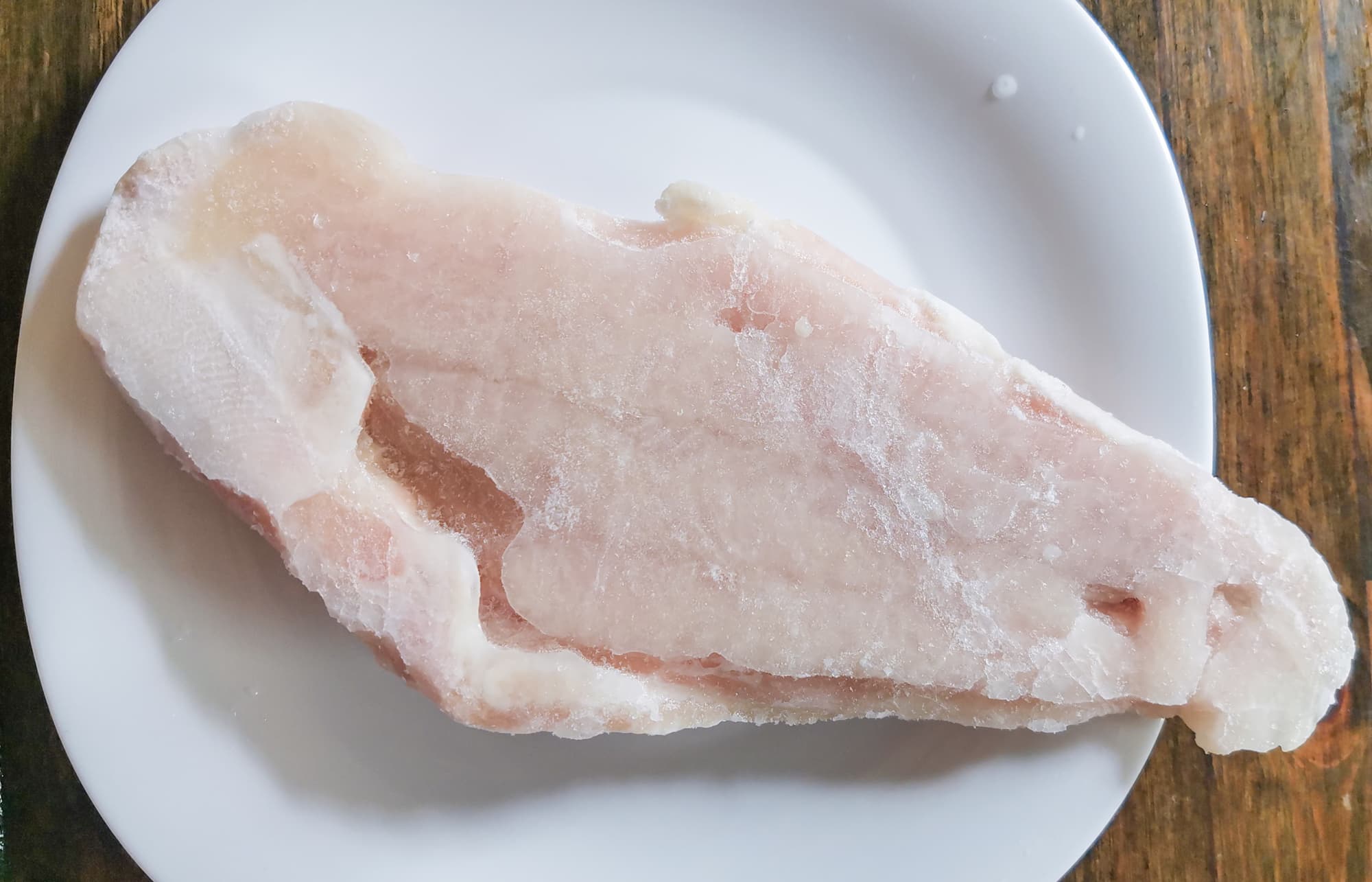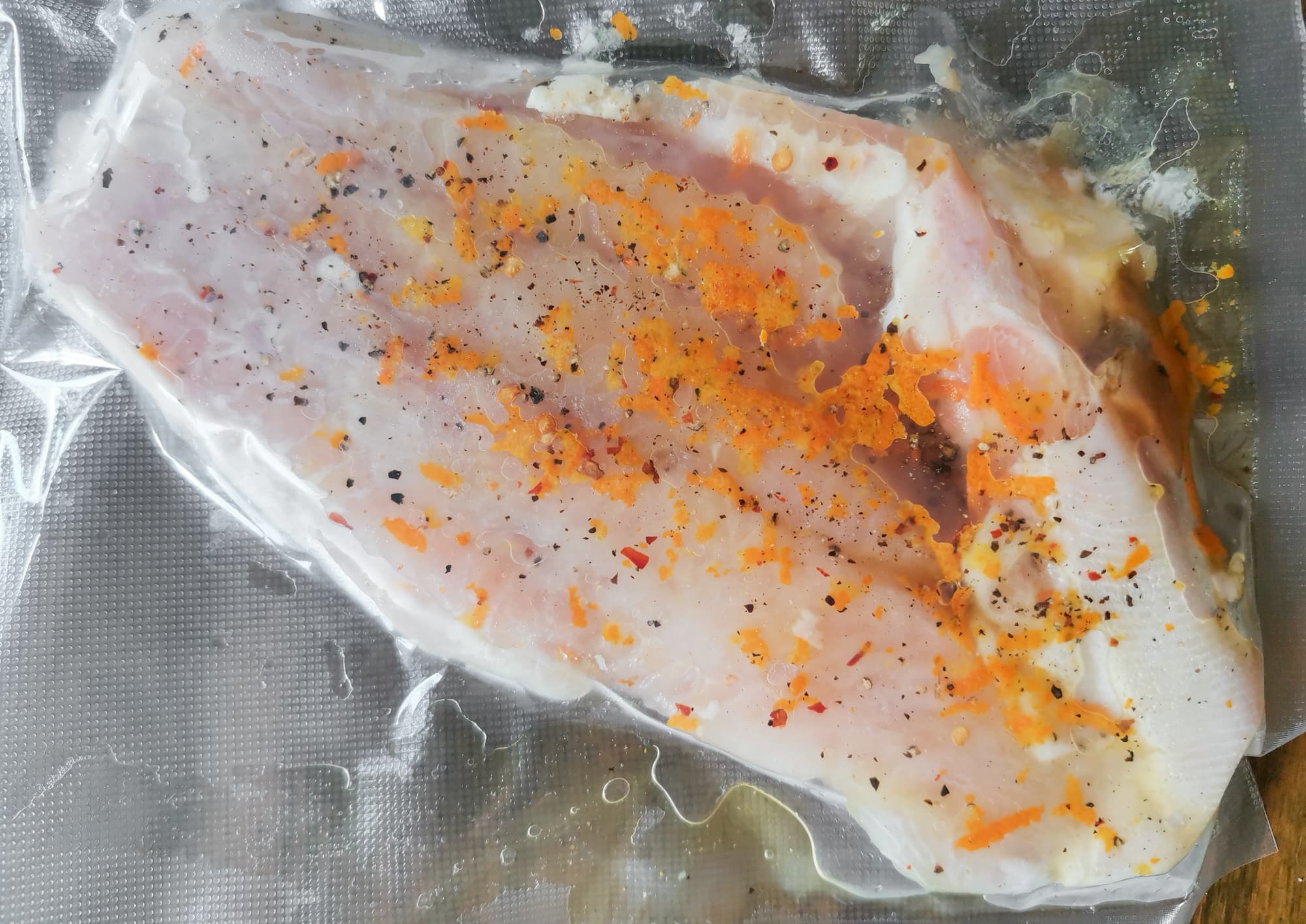 макрорус в собственном соку с апельсиновой цедрой (филе рыбы мы при этом даже не размораживали, а сразу поставили на 2,5 часа при температуре 65 °C),