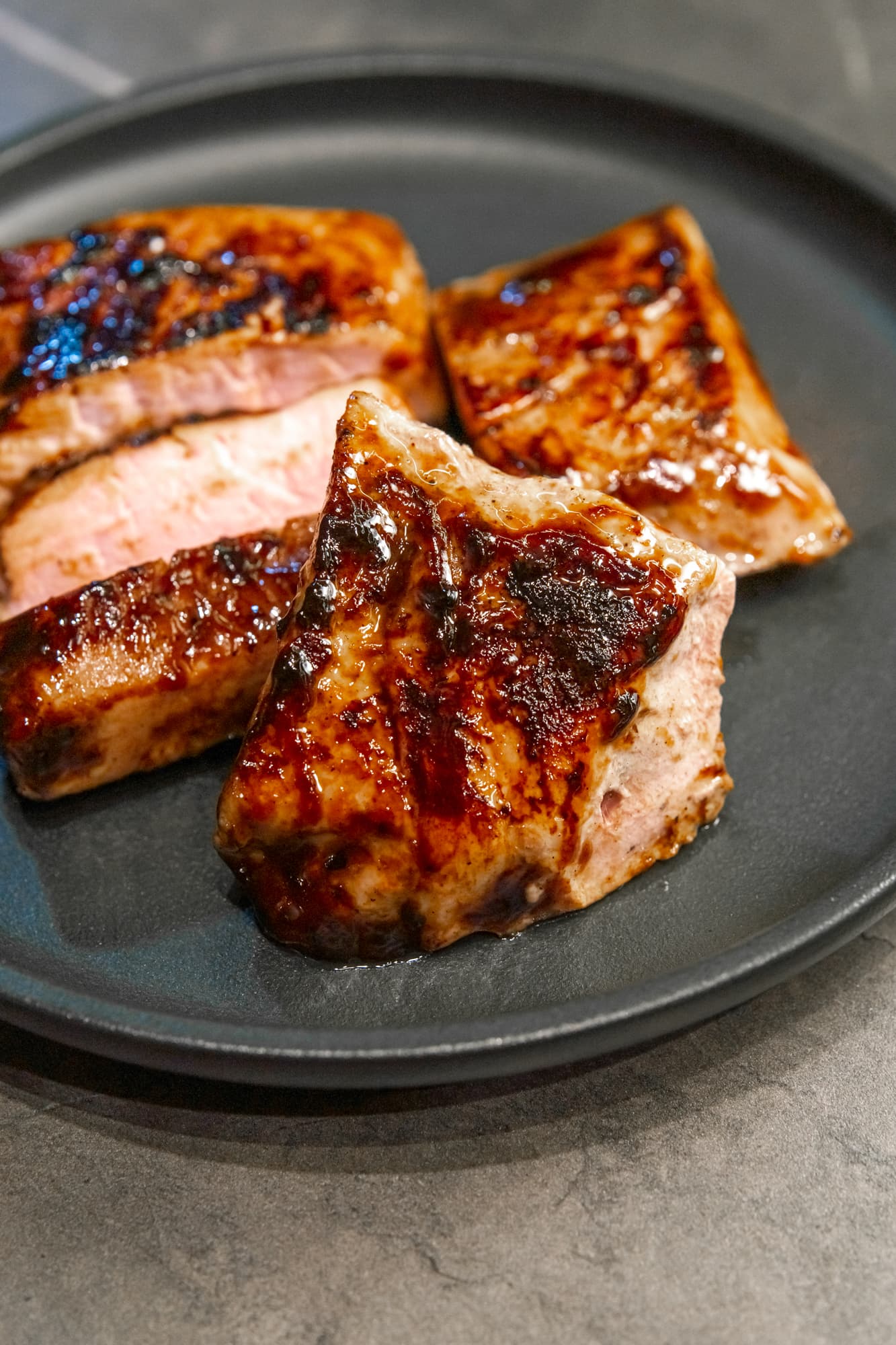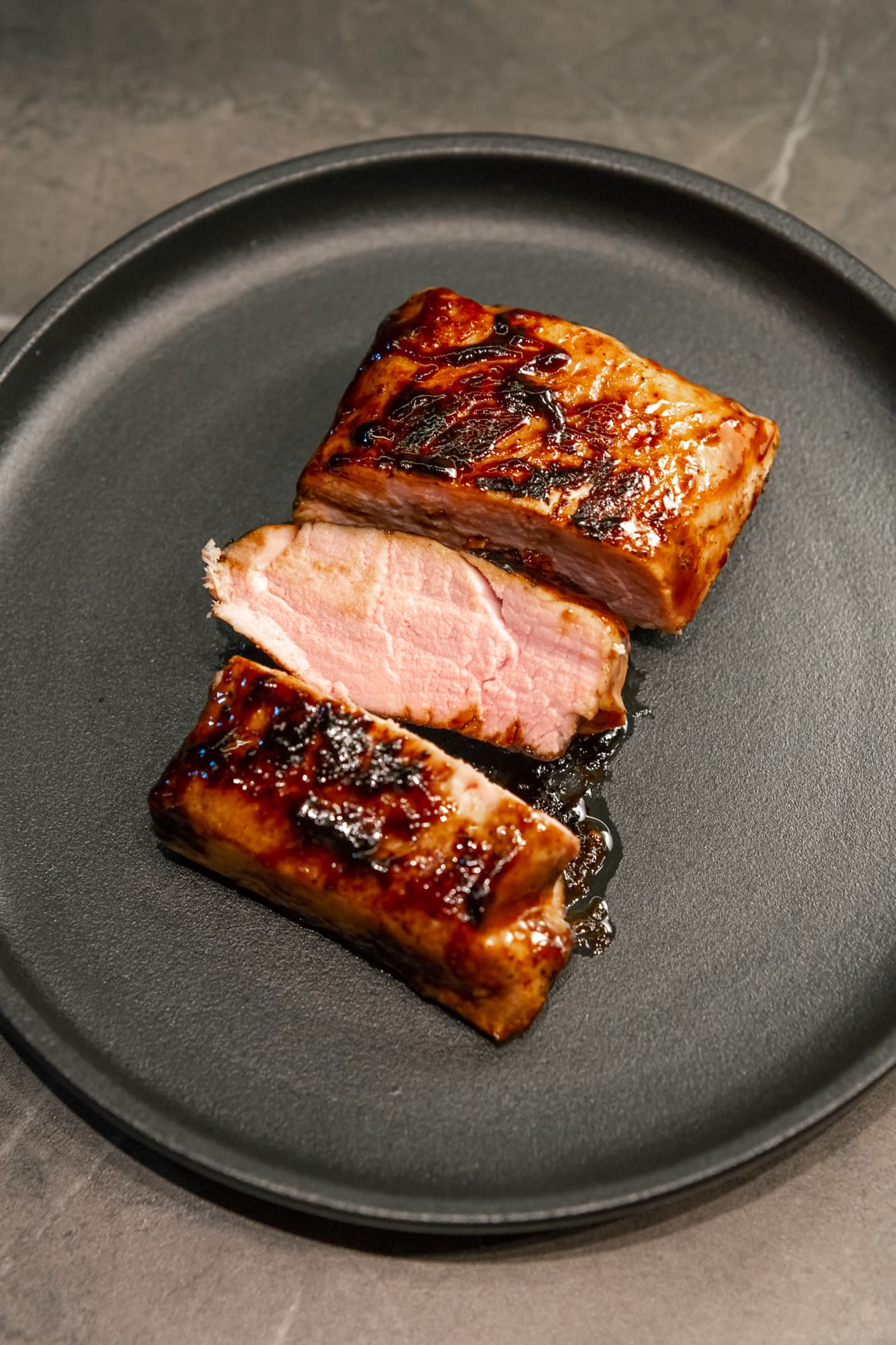 В качестве теста мы приготовили свиную вырезку с глазурью из соуса хой син.
