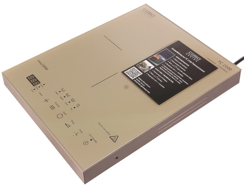 Сочетание нагревательного прибора и термощупа (то есть контроля температуры) в большинстве случаев намекает, что прибор подойдет для приготовления методом су-вид. В связи с этим не можем не упомянуть еще раз нашу любимую электроплитку с индукционным нагревом — Caso TC 2100. По техническим характеристикам это вполне обычная плитка, не выделяющаяся ни повышенной мощностью, ни какими-либо необычными решениями.