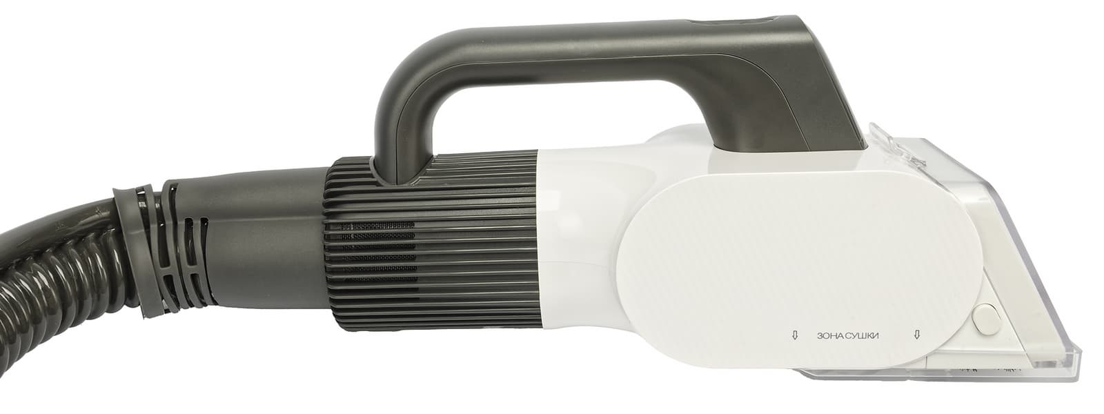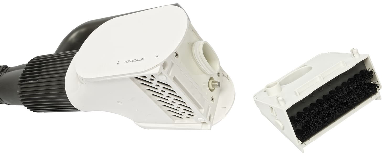 Двойной шланг с силиконовым покрытием соединяет корпус и рабочий инструмент — щетку: по трубке в зону уборки поступают, в зависимости от выбранного режима работы, вода или горячий пар, а через гофрированную трубу в обратном направлении движется поток воздуха, использованной или собранной воды и грязи. Щетка разборная, ее чистящий модуль можно снять и промыть.