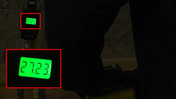 Последний показатель, который видеокамера сумела зафиксировать перед смертью тестового стенда — 27 Н·м. Разумеется, это не соответствует действительности. Крутящий момент нашего шуруповерта выше как минимум вдвое. Похоже, что он составляет те самые 55 Н·м, указанные в паспорте инструмента.