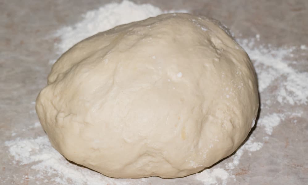 После того, как был сформован ком теста, приостановили процесс и потрогали тесто. Оно показалось мягким, поэтому всыпали еще пару ложек муки.