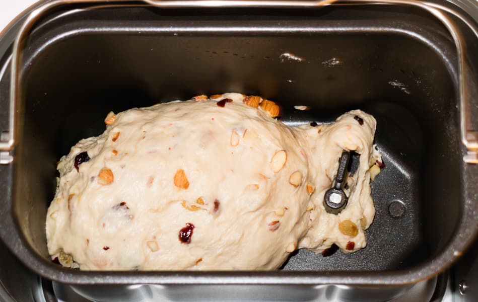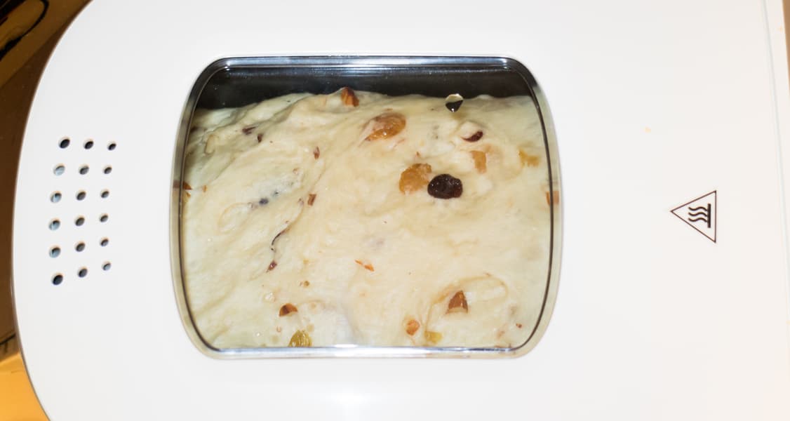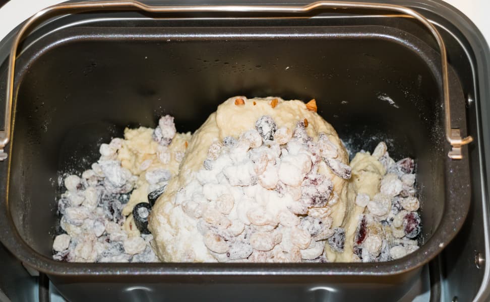 Растворили дрожжи в теплом молоке, добавили ванильный экстракт, масло, соль, сахар и муку. Запустили восьмую программу, которая называется «Сливочный хлеб». Тесто по окончании первого замеса получилось мягкое, гладкое. Когда раздался сигнал о добавлении дополнительных ингредиентов, мы всыпали порубленный миндаль, вяленую клюкву, вымытый и предварительно немного замоченный в воде изюм. В сухофрукты перед добавлением в форму всыпали примерно полторы ложки муки и хорошо встряхнули, чтобы каждая ягода со всех сторон была обсыпана мукой — так они равномернее распределятся по всему объему теста.